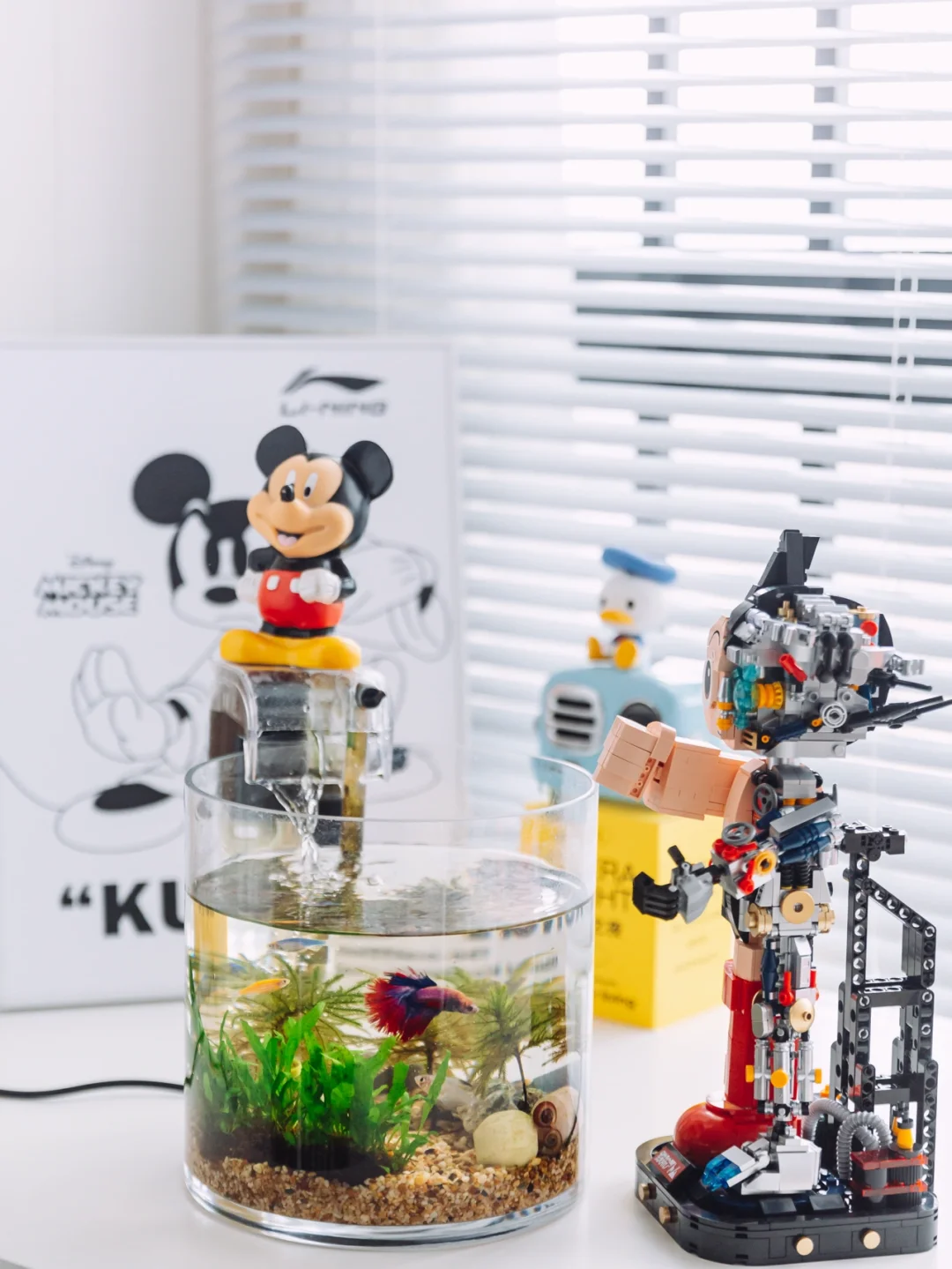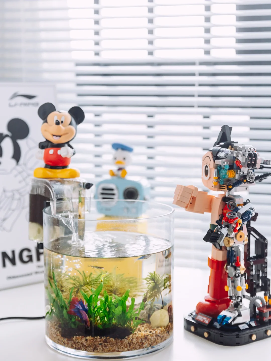 周一又是给玻璃鱼缸换水日。 清洗完鱼缸壁与过滤器,这次换了三分之二的水。 有打算单独再买个小鱼缸放斗鱼。 现在鱼缸里一共有九只鱼🐟 感觉稍微多了。 - 立冬过后,气温降低,想入个电热棒保持水温。 放鱼缸的飘窗这周有铁臂阿童木守护 颜值超高的机械积木 - 之前很多小伙伴问鱼缸过滤器 我特意在PDD上找了⛓🛒 放在图9 1️⃣ 超白玻璃鱼缸 尺寸20*20 2️⃣鱼缸壁挂式过滤器净水循环瀑布三合一 3️⃣鱼缸Led灯 加在一起不到1️⃣百元,真的太快乐!
