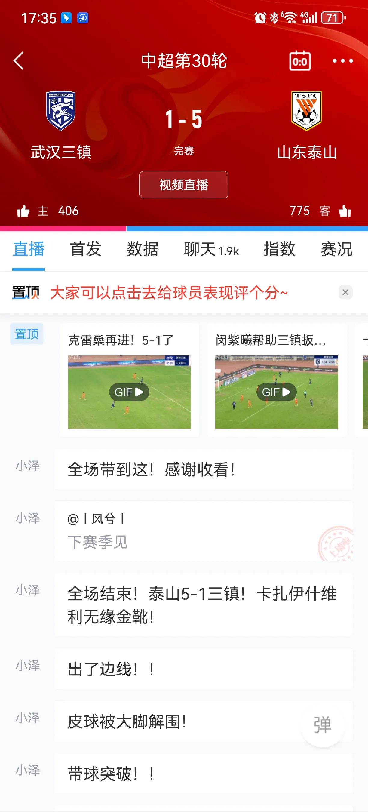 泰山大比分失利? 一比五,裁判吹响终场哨后,泰山球员非常沮丧,韩鹏也非常凝重,看场面还以为泰山是1,武汉是5。 结果当然是泰山赢了,而球员们不开心是因为没有帮到瓦科拿金靴,这是赛前的一项目标。其实今天所有球员都优先把机会给瓦科,可惜瓦科浪费了两三次绝佳进球机会。法比奥那边大四喜,最终逆转拿到金靴。 最后的场面能看到球员们很团结,泰山大比分领先,但是在场上不敢耽误一点时间。没能拿到当然可惜,但是法比奥也很出色,获得金靴也是自己实力的展现。
