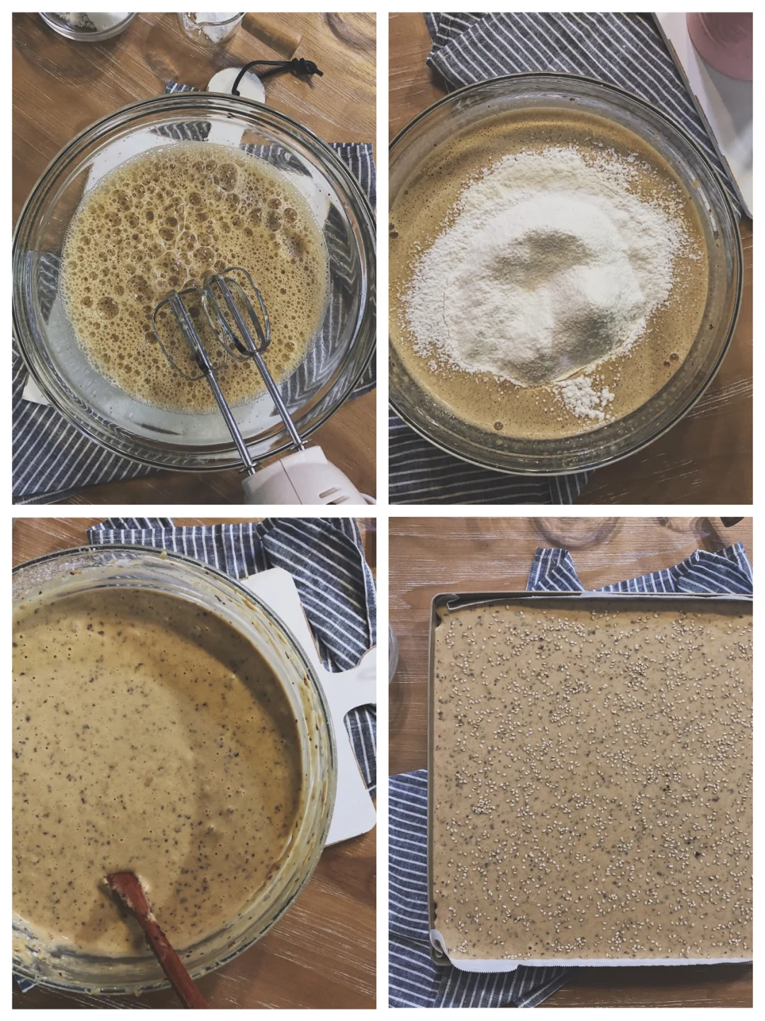 6️⃣烤盘垫油纸,蛋糕糊倒入模具中,撒上白芝麻后将蛋糕糊震出大气泡。
