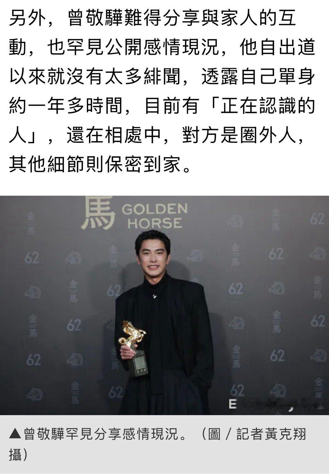 刚得到最佳男配的曾敬骅在被媒体问到感情状况时,透露自己单身一年多,目前有“正在认识的人”,且是圈外人都不敢想这种“流量小生”爆自己感情状况的情况在内娱会面临什么腥风血雨……