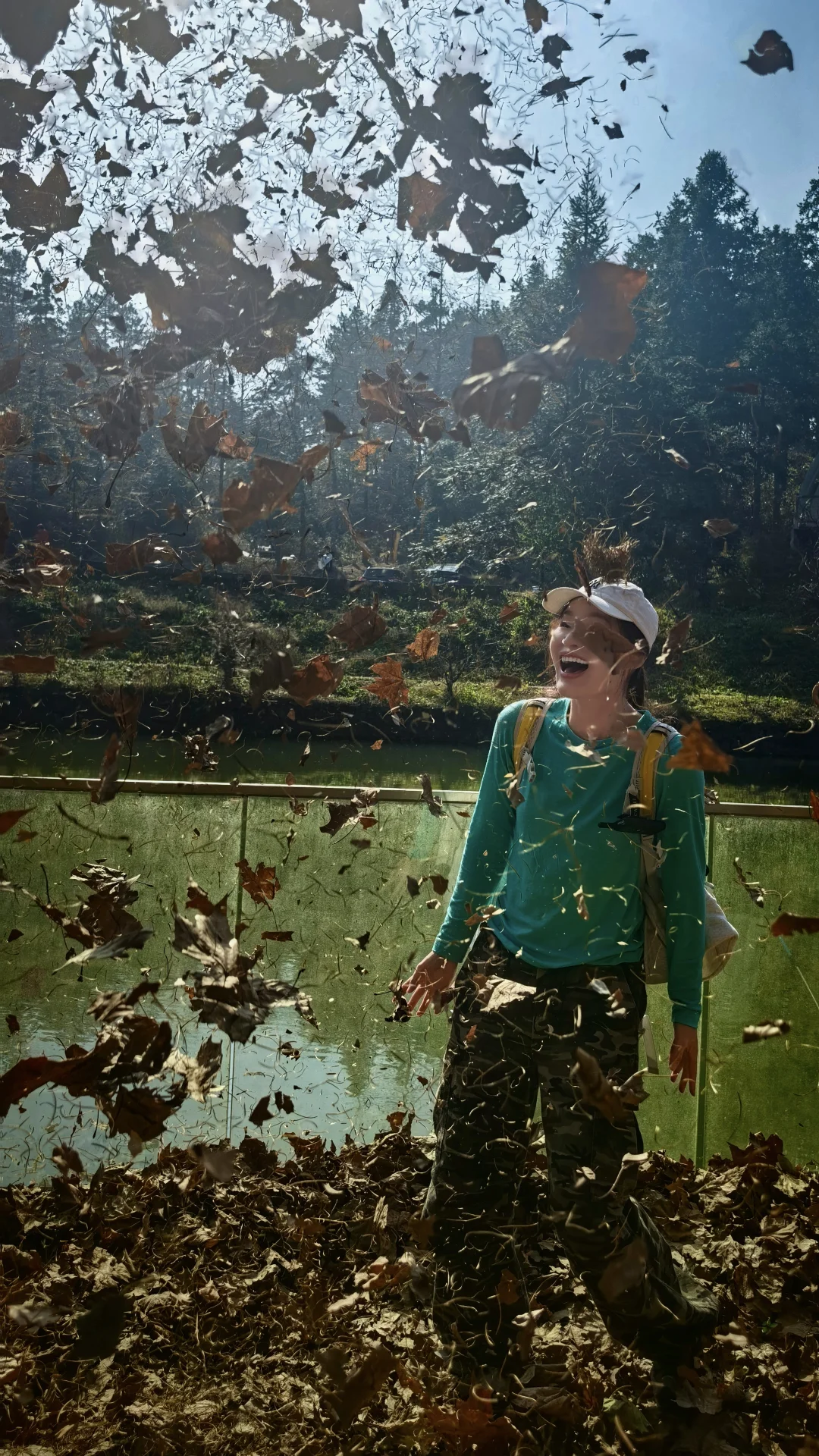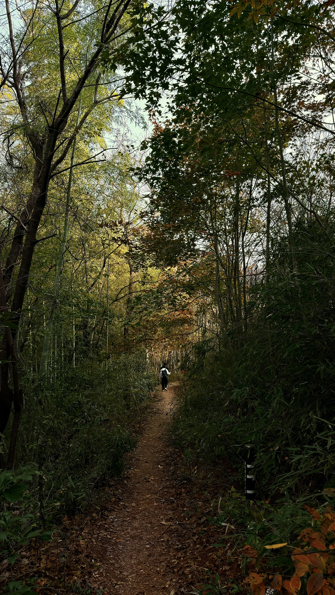 4. 冬瓜湖—美玲小道—东姜坑村(约2km):这是环线的精华路段,地面铺着厚厚的松针,走起来松软舒适。山腰以下红枫连绵,下坡路段较缓,注意放慢脚步即可,最后沿小道返回起点,结束行程。