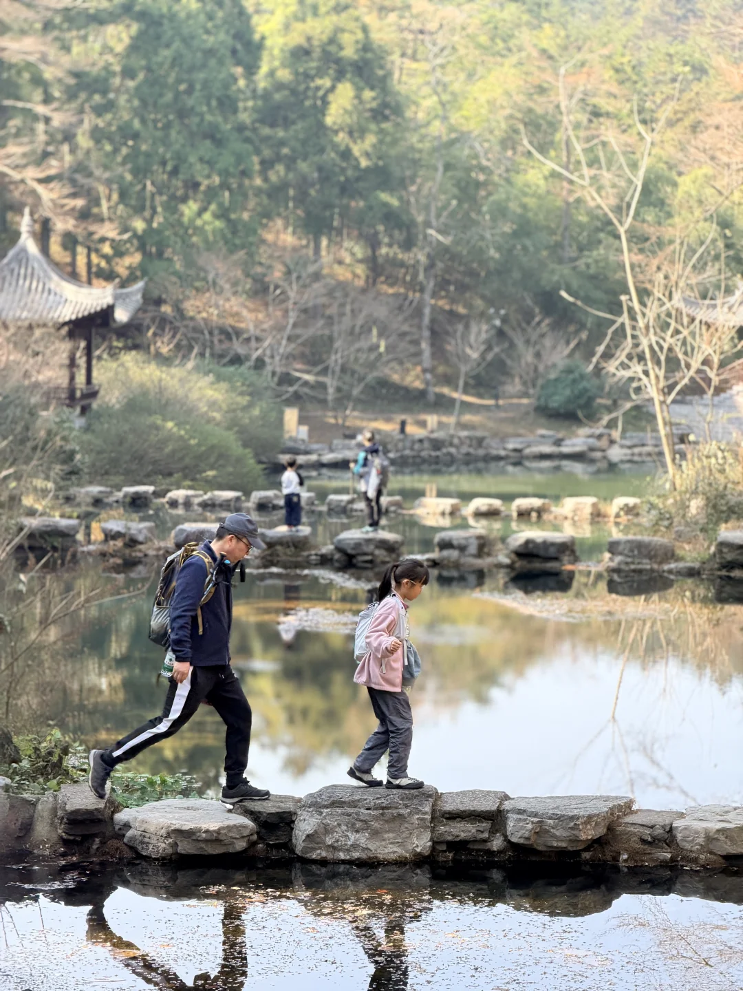 2. 陈家水库—云海营区(约2.5km):走青石步道前行,沿途能看到大片金钱松,秋日里针叶泛黄,氛围感拉满。到云海营区后可稍作休整,这里有餐厅、咖啡屋,还有儿童游乐设施,适合带娃家庭短暂停留。