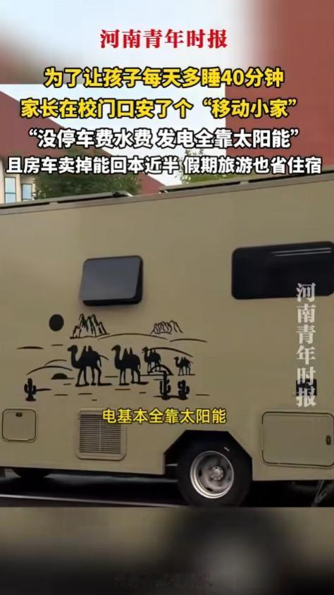 “太有头脑了!”山东,一对夫妻为了让孩子早上多睡40分钟,直接买了辆房车停在学校门口,当学区房,没有停车费水费电费,比租房还划算。 据黄河微视11月21日报道,这家人原本住得离学校有一段距离,每天早上,为了赶上课,孩子不得不在清晨六点起床,吃饭、赶路、挤公交,路上堵车时甚至要花40多分钟才能到学校。 长期如此,孩子身心疲惫,上课状态也差,黑眼圈、哈欠连天,甚至影响了学习效率,夫妻俩看在眼里,既心疼又无奈。 为了改变现状,他们开始积极寻求解决办法,买学区房价格太高,而租房的话,学校附近的房租也不便宜。 夫妻俩算了一笔账,孩子初中的三年学费加上租房费用,至少要花费20多万元,经过一番深入讨论,他们冒出了一个大胆的想法:不如直接买辆房车停在学校门口,当学区房! 说干就干,他们很快购置了一辆经济实用的房车,并挪到距离学校几十米的地方,车顶装了太阳能板,能够实现照明、电器供电,甚至可以用微波炉热饭。 不仅如此,他们还特意规划了储物空间和学习区域,让孩子可以在一个安静舒适的环境中完成作业。 房车的日常开销仅需购买食材,家用的冰箱可以随时储备新鲜蔬菜和蛋类,完全满足基本生活需求,这种新颖的陪读形式既省下了昂贵的房租费用,还节约了孩子宝贵的时间。 仔细想想,这段特殊的陪读之路确实解决了不少问题,孩子每天放学后,只需步行几分钟就能到家,路程的压力完全被省去。 他不用早起赶通勤,早晨甚至可以花更多时间慢慢吃早餐,以更好的精神状态开始一天的学习。夫妻俩也坦言,这样的陪读方式除了成本低,还能为家庭生活增添乐趣。 周末,他们时常开着房车出去玩,全家的亲子时光因此更加充实,然而,房车陪读能否真正成为一种可行的“学区房替代方案”?网友在评论区展开了热烈的讨论。 一部分人从经济角度表示赞同:“真是聪明,这样的配置性价比太高了,不仅节省了时间,也节省了不少钱,家长太有智慧了!” 另一部分网友则提出质疑:“房车空间小,孩子长期待在里面没有独立空间,对成长有没有影响?而且生活舒适度也难以保证。” 其实,这种陪读形式确实有它的局限性,环境空间有限,生活设施比起传统家居要简陋许多,尤其是对于能否一直坚持下去,是一个现实问题。 但说到底,每个家庭背后都有各自的境况,有些人选择豪掷千金买学区房,有些人倾向于租房,而这对夫妻选择了更灵活的陪读方式,只要适合自己,又不影响别人,这样的方式无可厚非。 作为父母,我们都希望能给孩子提供一个适合学习和成长的好环境,这对夫妻选择房车陪读,其实更多体现的是作为父母的关怀。 从根本上来说并不是形式的重要,而是这份爱与付出本身的重量,无论居住在学区房,租房,还是房车,父母的初心永远是为了孩子的未来。 许多网友在评论区表示:“陪读的形式并不重要,关键是父母是否全心全意地为孩子考虑。” “他们的初心,是孩子能够舒适、安全地学习,这样的爱挺真实。” 也有人留言:“有条件的话,支持多元的陪读方法,应该多一些理解和包容。” 最终,这件事给我们带来许多启发,或许陪读的形式并不是关键,关键是为孩子的成长真正做了多少努力,父母怎么用自己的方法表达爱,这样的爱不需要定义,更不需要他人评价。 或许,对于那些正在为学区房或陪读焦虑的父母来说,这种房车陪读的形式能提供一种全新的思路,让孩子睡得饱,学得好,感受到父母浓浓的关爱,这才是陪读的核心。 信源:黄河微视2025-11-21——为了让孩子每天多睡40分钟,家长在校门口安了个“移动小家”没停车费水费,发电全靠太阳能”,且房车卖掉能回本近半 假期旅游也省住宿“