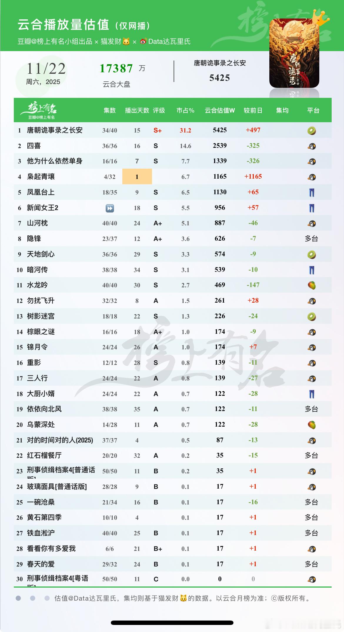 11.22云合估值,大盘17387w🌴豆瓣榜上有名小组出品 首日云合6.7%,1165万 云合占比超30%❗️5425单集 1339,降326 1130,+65 超点完结956 887