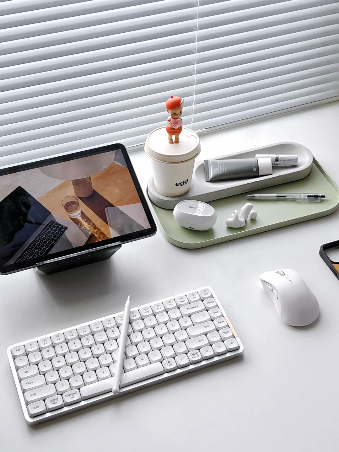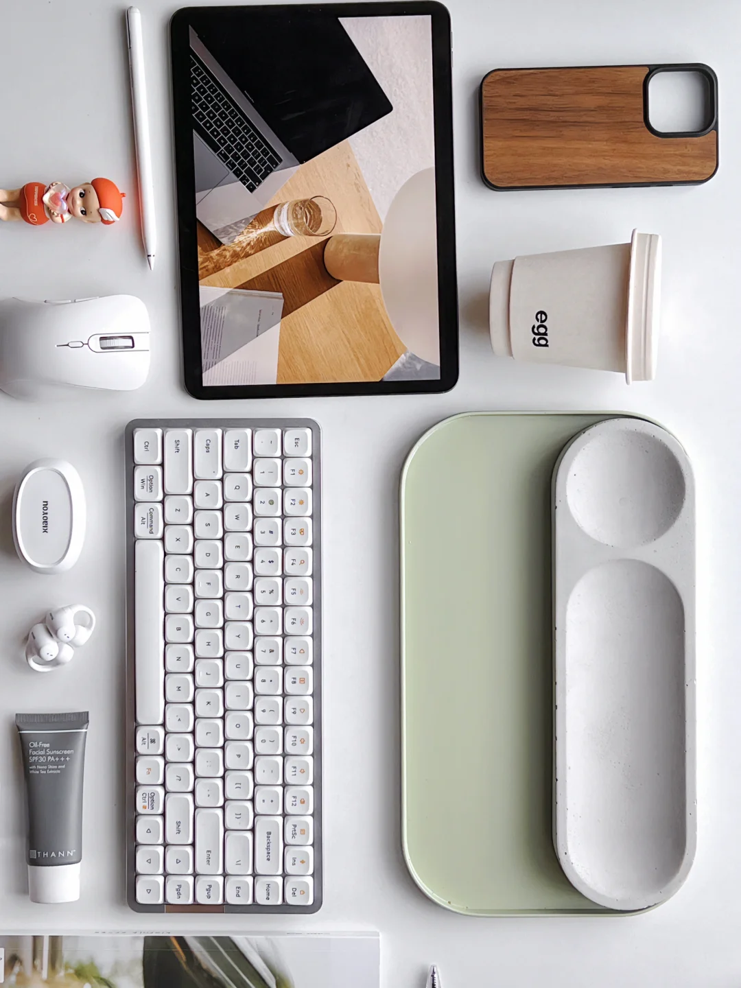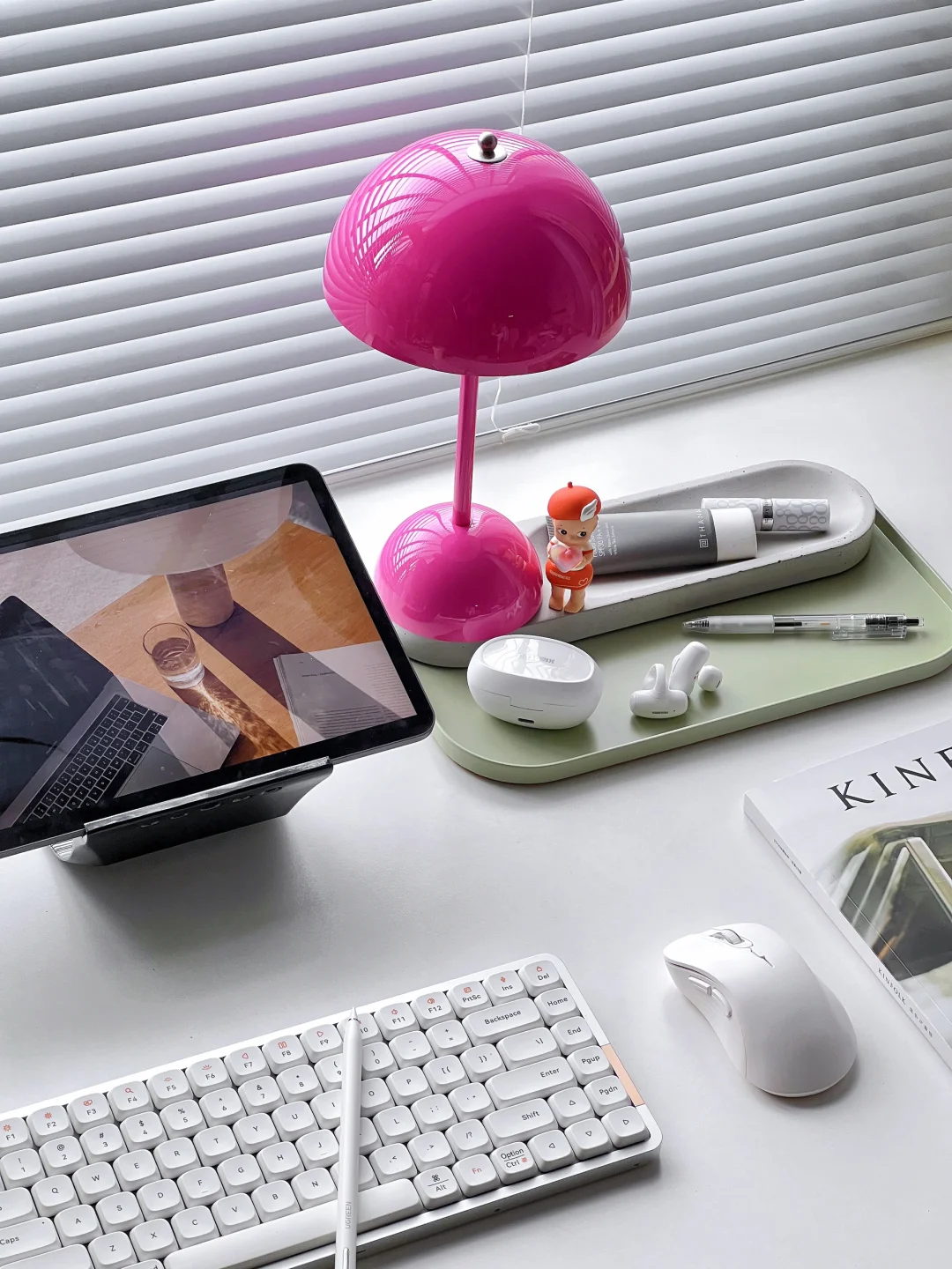 今日份极简风书桌分享 干净整洁的ins风桌面 只需一眼就氛围感满满。 - 🏷ipadpro 生产力工具 🏷Camino多功能极简桌面收纳 喜欢薄荷绿的色彩,水泥磁吸收纳+铁盘可分离式设计,底部有软木保护桌面,细节很到位! 🏷Lofree 小顺矮轴键盘 🏷Elecom 蓝牙鼠标 🏷Loomma ipad支架 🏷小幽蓝牙挂耳式耳机 🏷Sanlinba手机壳 🏷芭比粉花苞台灯 🏷Sonny Angel手办