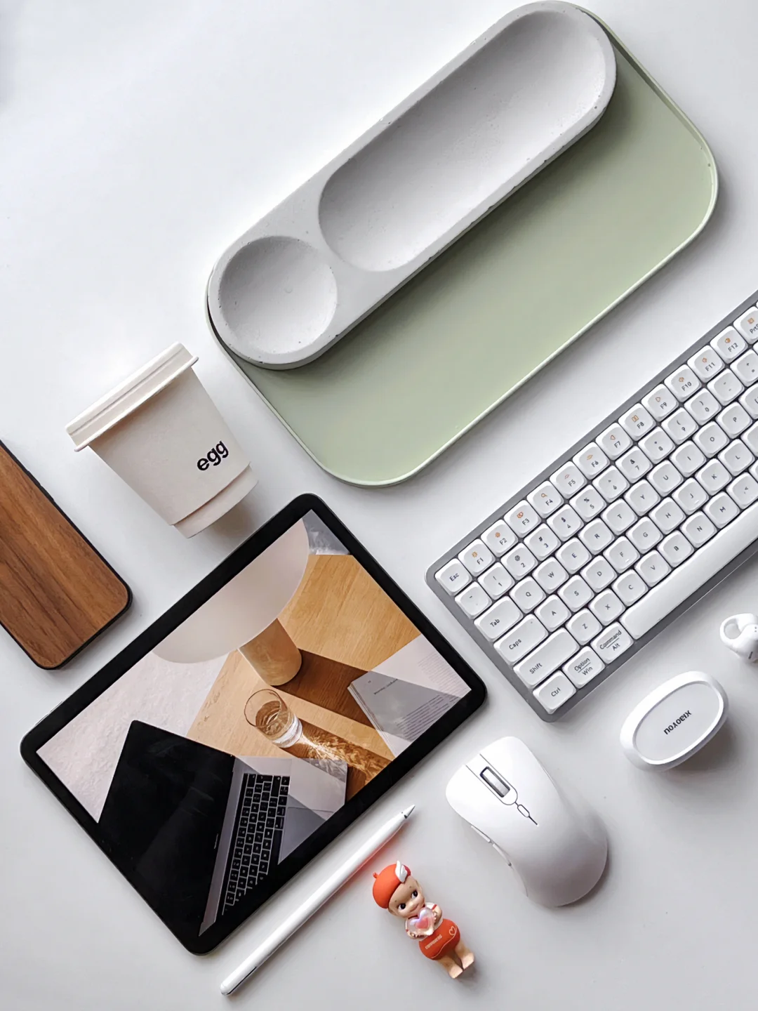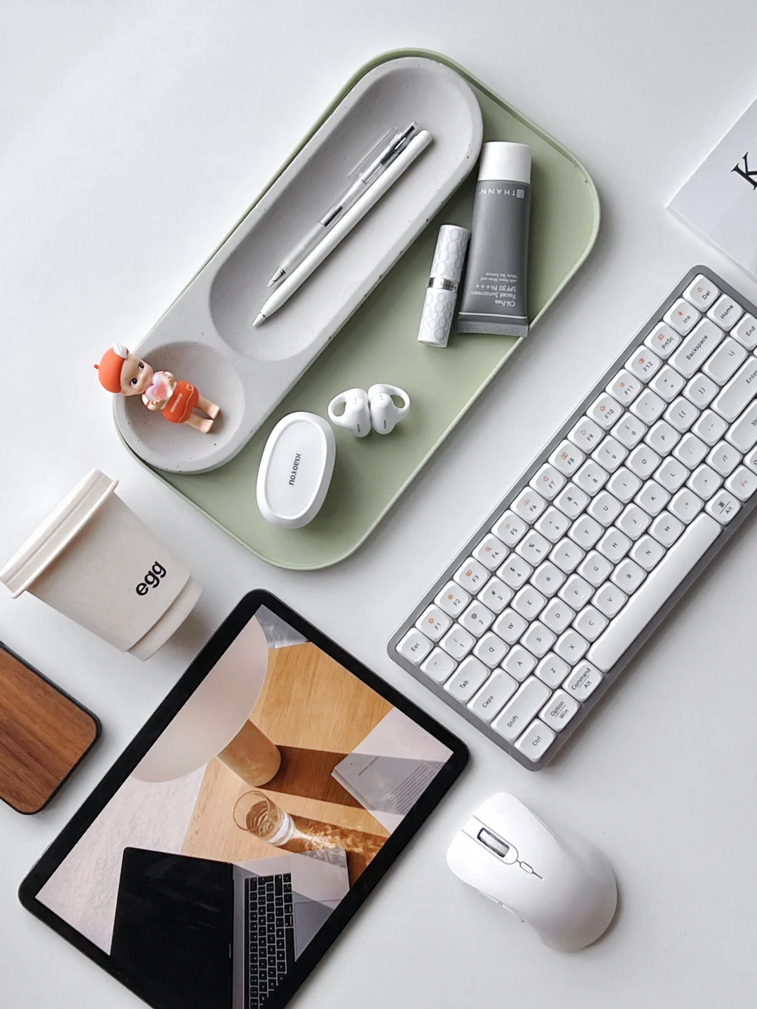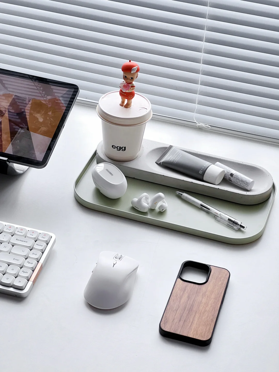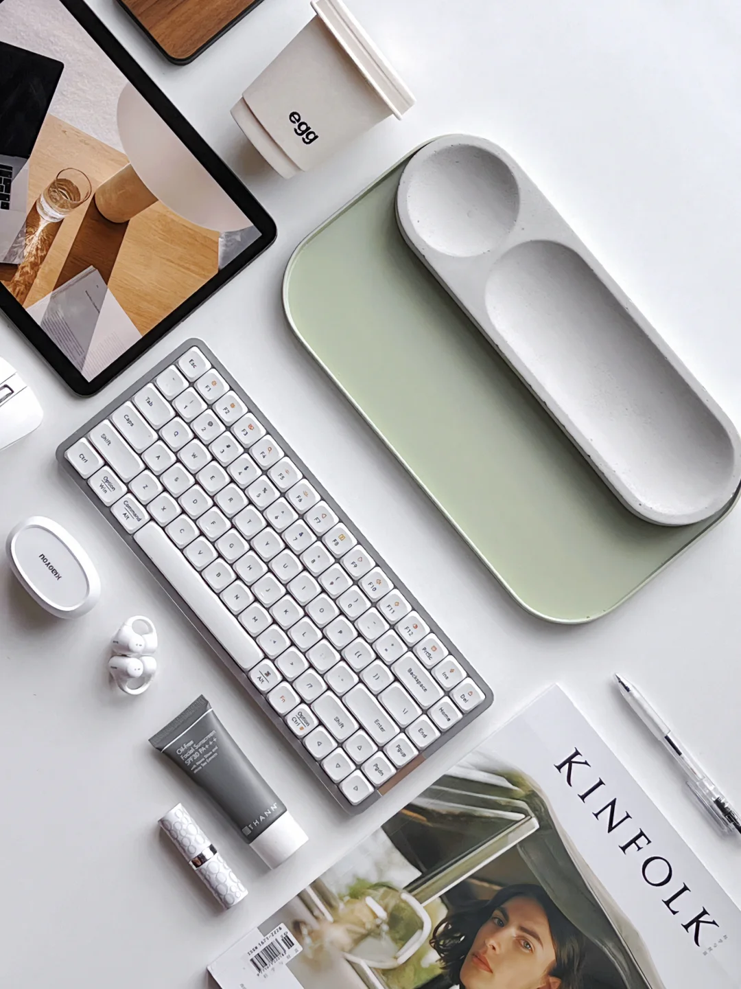 今日份极简风书桌分享 干净整洁的ins风桌面 只需一眼就氛围感满满。 - 🏷ipadpro 生产力工具 🏷Camino多功能极简桌面收纳 喜欢薄荷绿的色彩,水泥磁吸收纳+铁盘可分离式设计,底部有软木保护桌面,细节很到位! 🏷Lofree 小顺矮轴键盘 🏷Elecom 蓝牙鼠标 🏷Loomma ipad支架 🏷小幽蓝牙挂耳式耳机 🏷Sanlinba手机壳 🏷芭比粉花苞台灯 🏷Sonny Angel手办