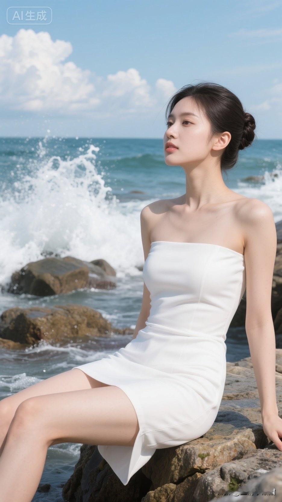 她这身是当下流行的“海边纯欲松弛风”穿搭:白色细吊带包臀裙适配礁石海岸场景,是现在很火的“清冷辣妹氛围感”思路,干净又自带柔媚吸睛气场。