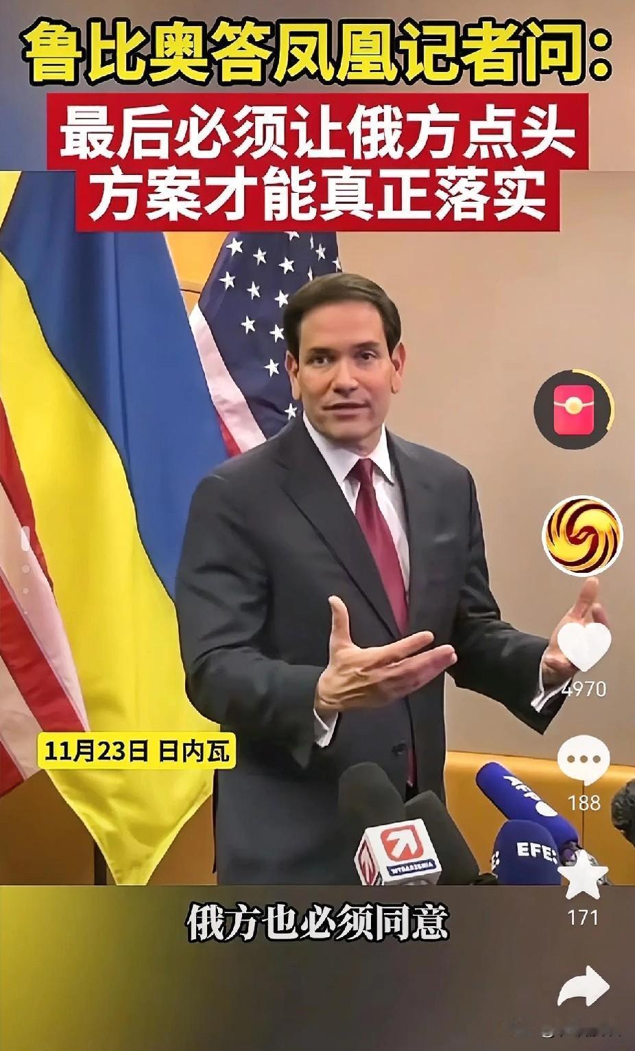 一场需要俄罗斯点头的“三国杀”。 2025年11月23日, 日内瓦美乌带着英法德组团闭门磋商, 把美方“28点和平计划”聊得热火朝天, 美国国务卿鲁比奥称赞会谈是“最有成果和最有意义的。” 但他又说了, 这方案得俄罗斯点头才行! 合着一群人忙活半天, 是在给俄罗斯“写提案”。 话说, 毕竞战场上谁拳头硬谁有话语权。 国际政治从来都是大国博弈, 小国买单的游戏。 这场没有主角的谈判, 本质就是西方阵营的“自我感动式磋商”。 这年头, 打赢了才配当裁判, 没俄方签字的和平协议, 不过是张废纸罢了。