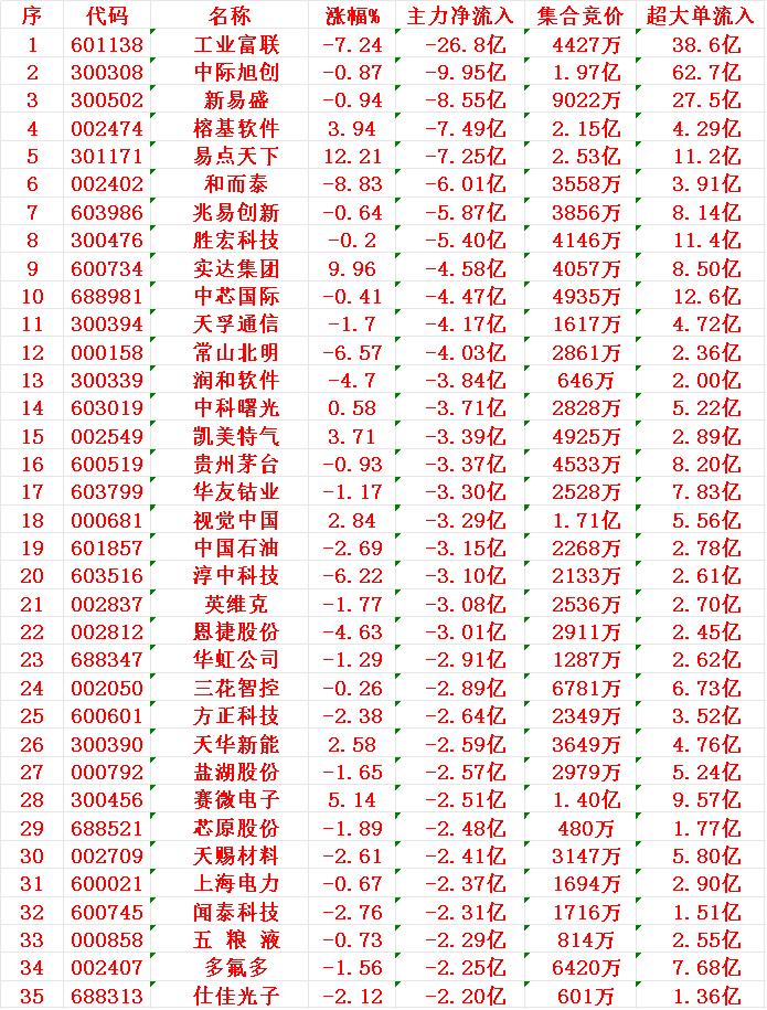 11月24日尾盘30分钟,主力资金大幅卖出的35名单! 工业富联:净流入 -26.8 亿元,超大单流入 38.6 亿元 中际旭创:净流入 -9.95 亿元,超大单流入 62.7 亿元 新易盛:净流入 -8.55 亿元,超大单流入 27.5 亿元 榕基软件:净流入 -7.49 亿元,超大单流入 4.29 亿元 易点天下:净流入 -7.25 亿元,超大单流入 11.2 亿元