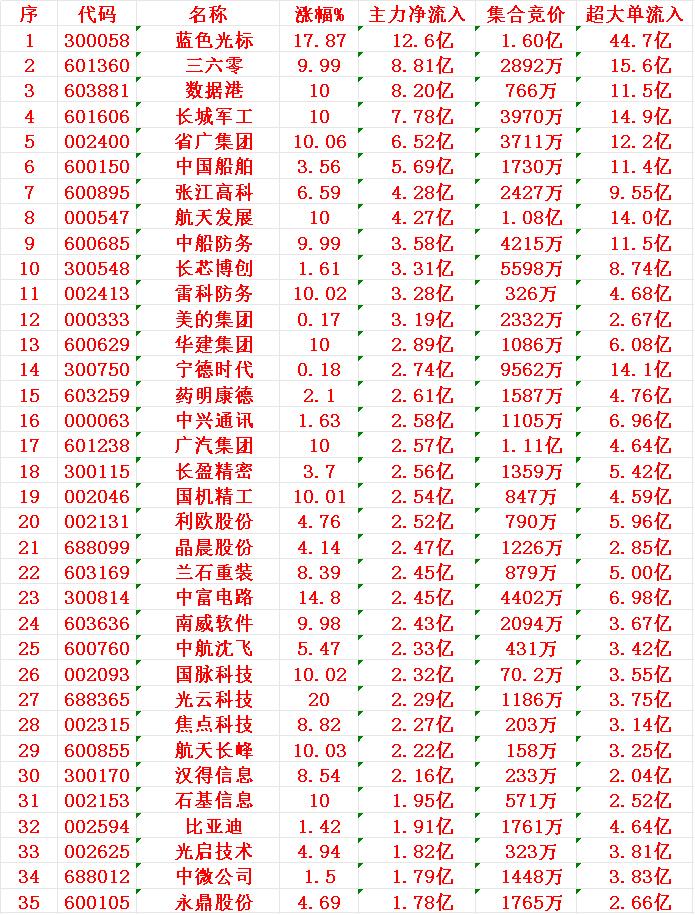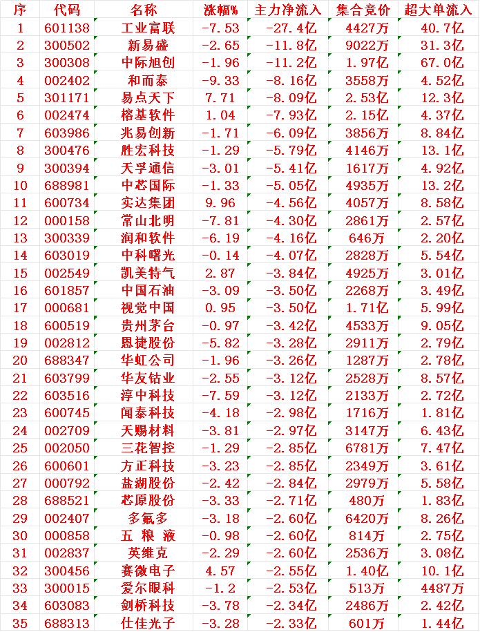 11月24日收盘,主力趁冲高,已经大幅卖出的35名单: 工业富联:净流入 -27.4 亿元 新易盛:净流入 -11.8 亿元 中际旭创:净流入 -11.2 亿元 和而泰:净流入 -8.16 亿元 易点天下:净流入 -8.09 亿元 榕基软件:净流入 -7.93 亿元 兆易创新:净流入 -6.09 亿元 胜宏科技:净流入 -5.79 亿元 11月24日收盘,主力资金“大幅买入”的35名单: 蓝色光标:净流入 12.6 亿元 三六零:净流入 8.81 亿元 数据港:净流入 8.20 亿元 长城军工:净流入 7.78 亿元 省广集团:净流入 6.52 亿元 中国船舶:净流入 5.69 亿元 张江高科:净流入 4.28 亿元 航天发展:净流入 4.27 亿元 中船防务:净流入 3.58 亿元 长芯博创:净流入 3.31 亿元 雷科防务:净流入 3.28 亿元 美的集团:净流入 3.19 亿元 华建集团:净流入 2.89 亿元 宁德时代:净流入 2.74 亿元 药明康德:净流入 2.61 亿元 中兴通讯:净流入 2.58 亿元 广汽集团:净流入 2.57 亿元 长盈精密:净流入 2.56 亿元 国机精工:净流入 2.54 亿元 利欧股份:净流入 2.52 亿元