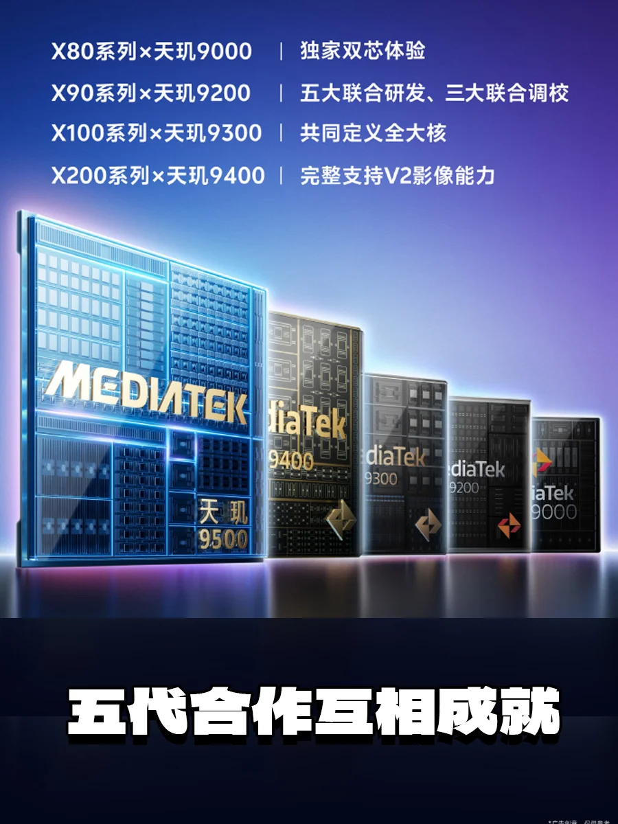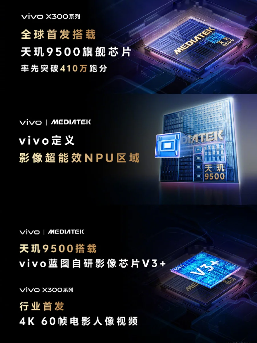 才发现,联发科这次和手机厂的\"联姻\"真的搞了大事,vivo X300系列官宣首发天玑9500!并且是共研特调的\n结果就是X300系列的跑分超过410W,直接把手机圈震得嗡嗡响💥\n\t\n这波操作让我彻底明白——原来天玑芯片的真正实力,真的要靠蓝厂才能解锁啊!\n\t\n蓝厂还在天玑9500芯片里划了块\"影像NPU自留地\",配合自研V3+影像芯片组成双核驱动,拍照追焦快准狠,录4K60fps电影人像视频时连发丝都根根分明~\n\t\n更有全球首发的端侧AI定制美颜,这波操作直接让高通,A19旗舰芯都看傻了👀\n\t\n从当年X80系列让天玑9000逆袭,到如今X300系列让天玑9500封神,vivo用五年时间把\"天玑调校看蓝厂\"变成了行业共识,这次更进化到\"蓝血天玑不设限\"\n\t\n10月的手机大战,蓝厂X300系列一定是值得等待的手机!大家期待吗?\n