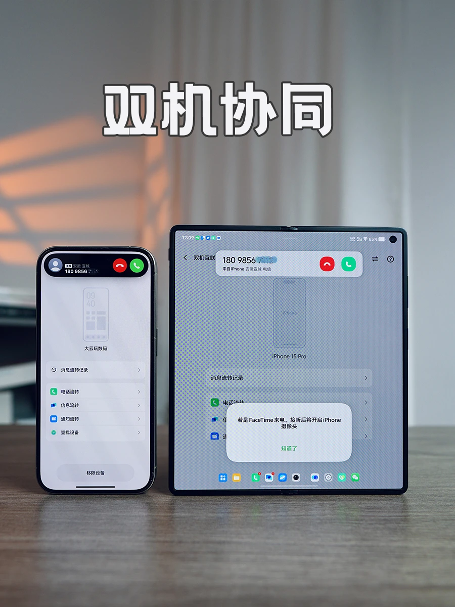 跨系统做到双机互联,同步iphone上的电话,信息,通知等,不在身边也能通过X Fold5及时看到信息,还互补iPhone信号差的弱势。