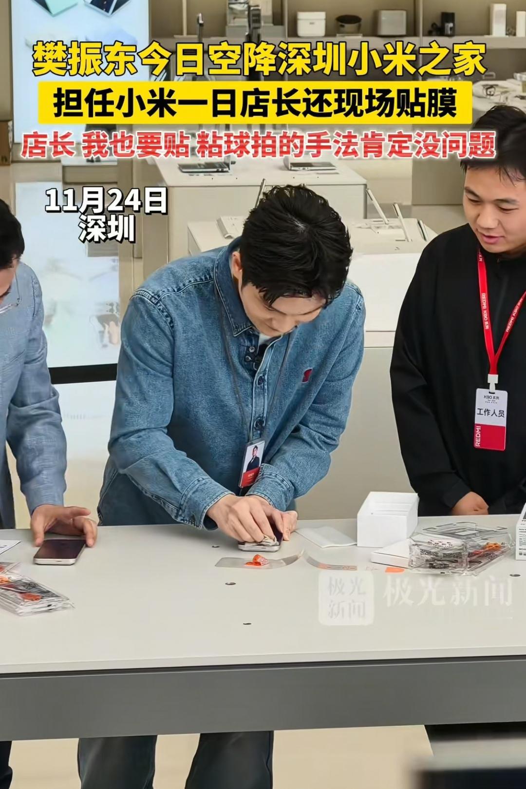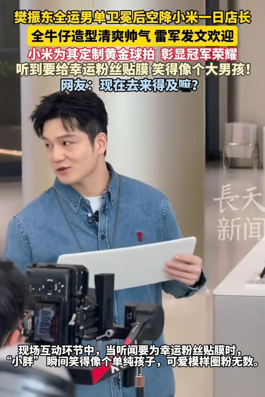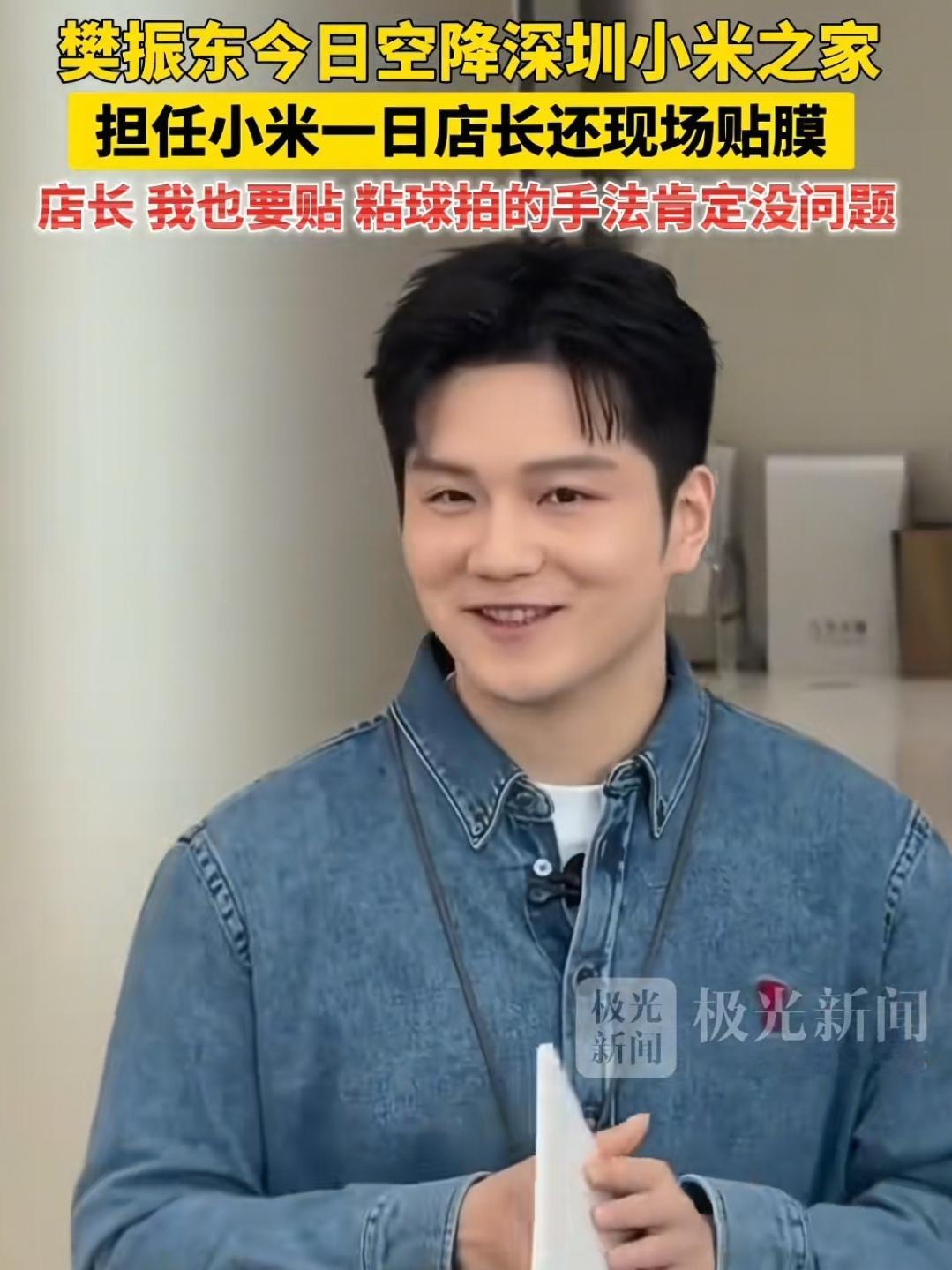 小米一日店长来啦!金球拍赠送全运会男单冠军,别说小米总裁雷军真的很用心,樊振东这个一日店长太值了。 小胖樊振东要到小米之家担任一日店长,小米方面提前放出消息了。 今天一早赛场下的樊振东,身着一套牛仔的樊振东来到深圳大厦小米之家旗舰店,化了淡妆的樊振东格外帅气迷人,真的就是一个邻家大哥哥的样子。 赛场下的樊振东总是给人跟赛场上的樊振东完全判若两人的感觉,赛场上的樊振东给人的感觉,总是绷得很紧的感觉,表情都是严阵以待的状态。 赛场下的樊振东亲切、松弛,清爽帅气,有那种一眼万年的感觉,给樊振东赠送金球拍的是小米的副总王晓雁,王副总还陪樊振东一起视察了小米大厦。 今天樊振东在小米之家给顾客推荐的是一款小米的K9系列手机,一日店长还拼手帮客户贴膜,贴膜跟粘球拍都需要非常耐心,相信东哥可以的。