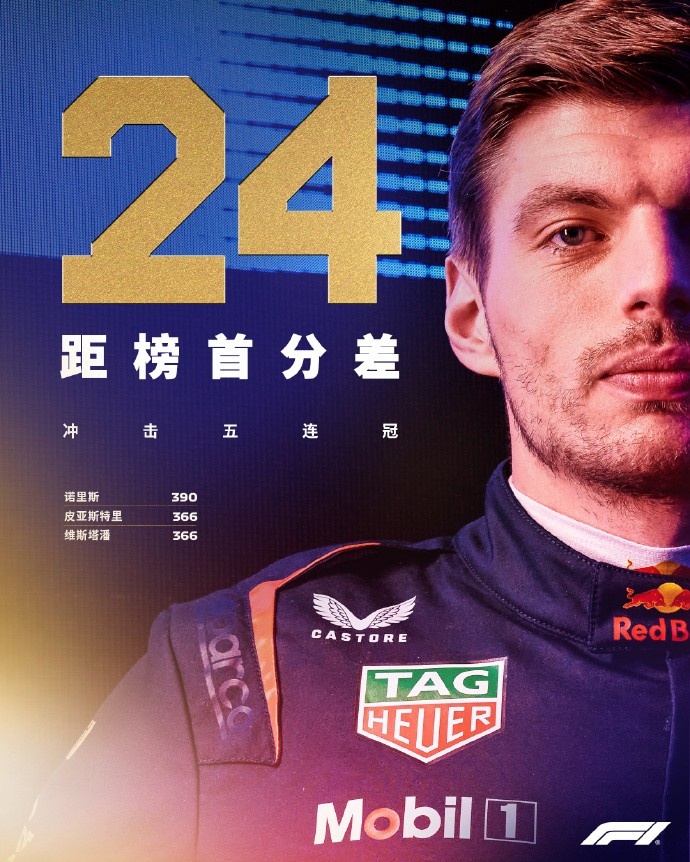 F1拉斯维加斯大奖赛,维斯塔潘夺冠,诺里斯和皮亚斯特里未过车检成绩被取消。车手积分榜方面,诺里斯390分领跑,维斯塔潘和皮亚斯特里366分第二。