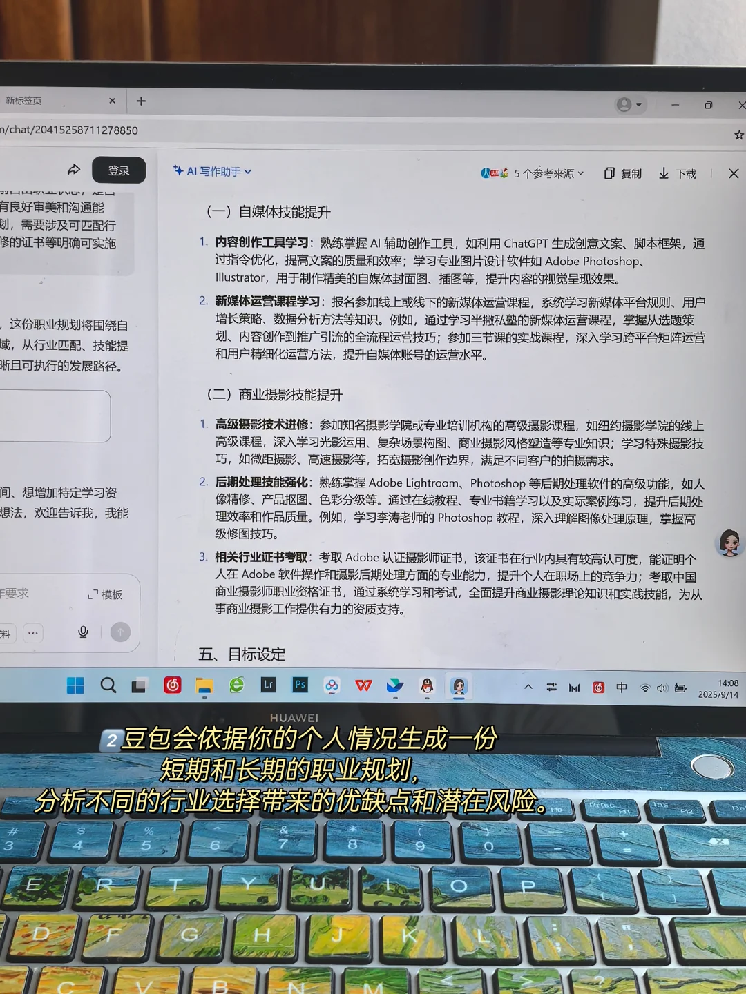2⃣无论是找工作做打工人又还是继续做创业都各有优缺,豆包会依据你的个人情况生成一份短期和长期的职业规划,分析不同的行业选择带来的优缺点和潜在风险。还会针对性给出需要提升的建议,跟着做方向更清晰。