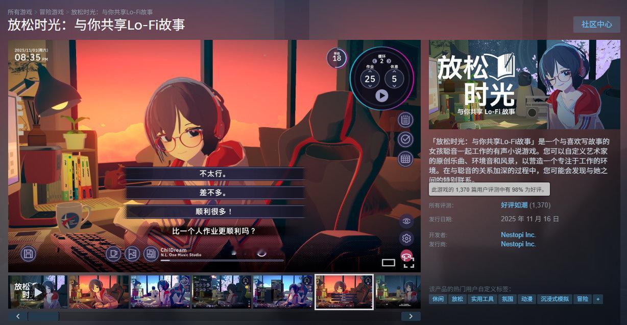 工作陪伴有声小说游戏《Chill with You : Lo-Fi Story》销量突破6万份贺图公开,本作目前仍在上享首发优惠,折后31.2元,支持中文,好评率为98%,收录超1300篇玩家评测。