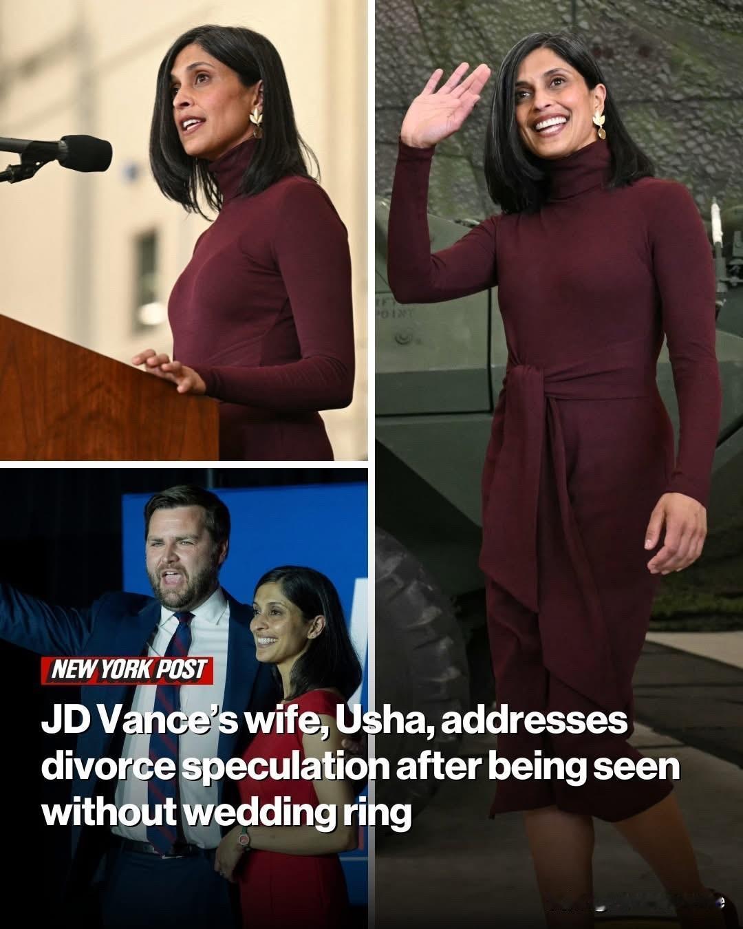 美国各大媒体纷纷报道突发新闻:美国副总统万斯/JD Vance 的妻子 乌莎/Usha 否认了与丈夫分居的传闻。 此前,有人看到她在北卡罗来纳州杰克逊维尔的勒琼营访问时没有佩戴结婚戒指。 “乌莎是三个孩子的母亲,她要洗很多碗,给孩子们洗澡,而且有时会忘记戴戒指,”她的发言人在给《人物》杂志的一份声明中说。