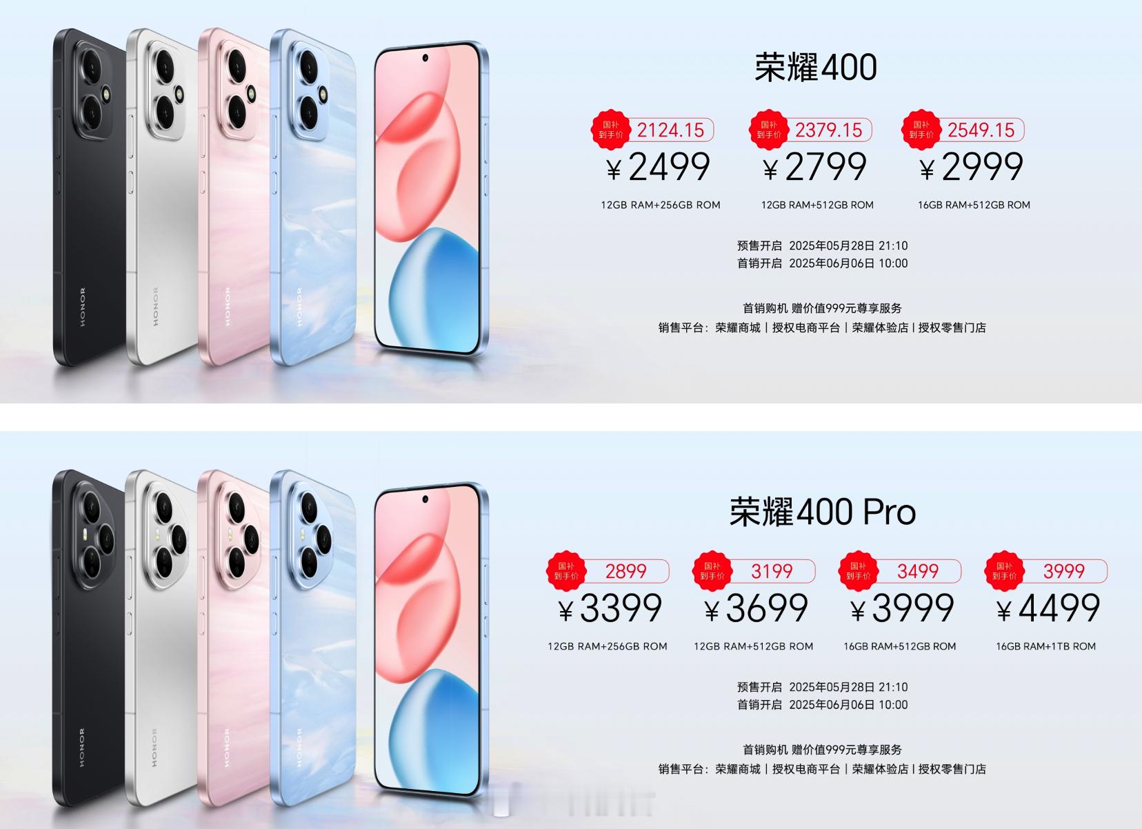 荣耀500(骁龙8s Gen4)12+256 2699;涨价20012+512 2999;涨价20016+512 3299;涨价300荣耀500 Pro(骁龙8至尊版)12+256 3599;涨价20012+512 3899;涨价20016+512 4199;涨价20016+1T 4799;涨价300
