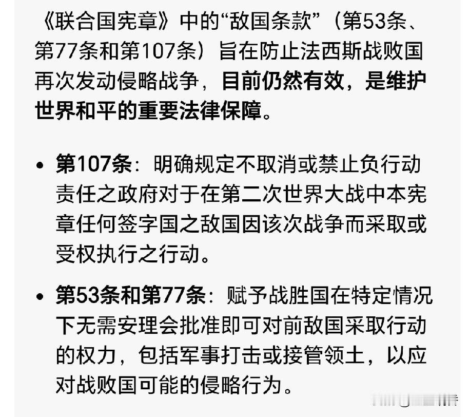 日本在台湾岛附近部署进攻行武器,很明显是针对中国,威胁中国恐吓中国,很有可能再次发起对中国的入侵。基于此,中国有必要根据联合国宪章中“敌国条款”55 条、77 条及 107 条中所规定,可以随时未经联合国安理会授权下打击日本所部署威胁之武器,及打击全日本本土。这是联合国宪章赋予战胜国及安理会常任理事国的权利,所以只要战胜国一方认为纳粹主义及军国主义有再次威胁他国的行为及动作。 虽然中国是爱好和平的国家,但和平的前提是战败国日本要老老实实的做事,而不是肆意妄为的不断向中国及亚洲其他国家挑衅。中国应该昭告天下基于近期日本不断向中国及亚洲国家发出动武的信号,中国便可随时向发起打击恐吓中国及亚洲国家的日本报复性打击,以维持亚洲及维护联合国宪章的尊严。