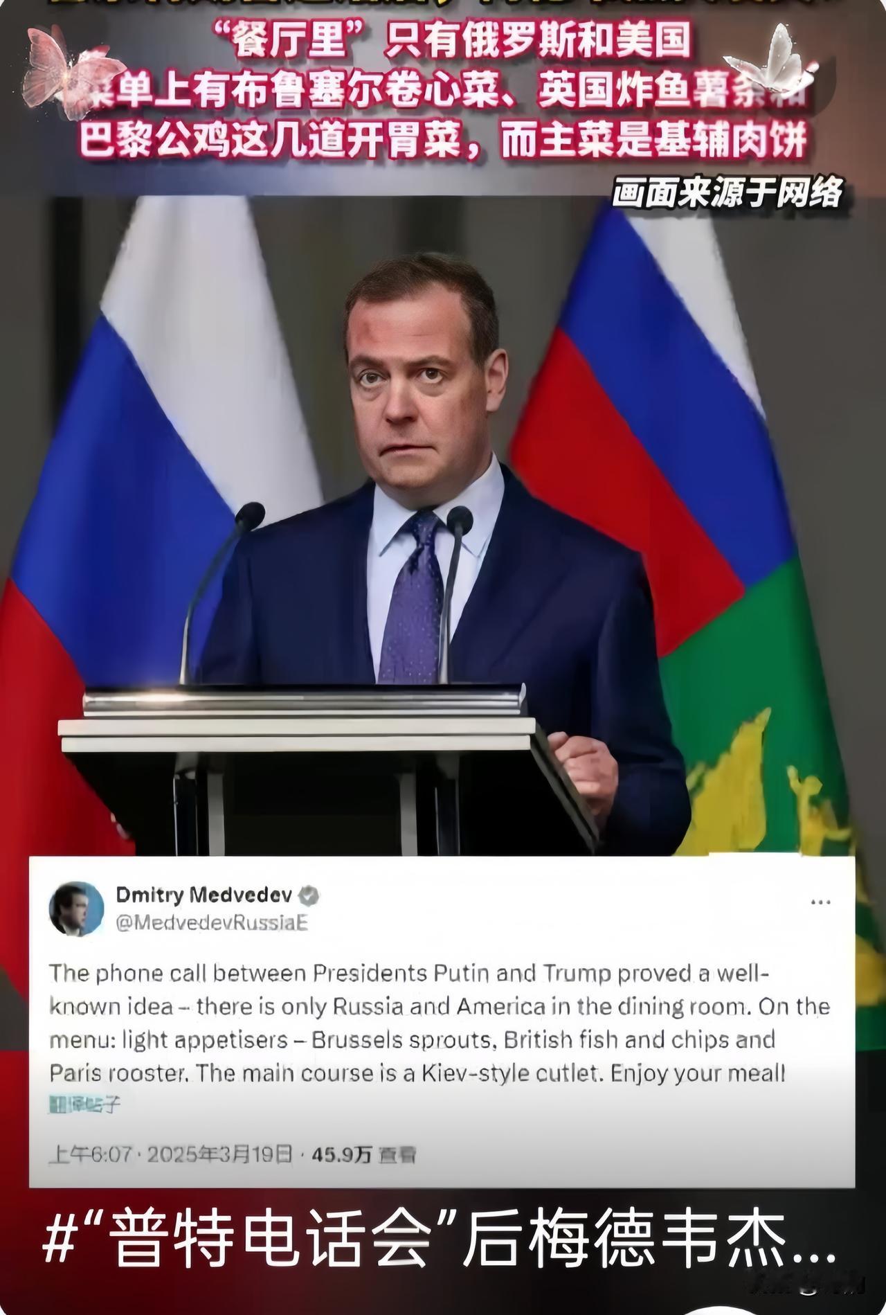俄美主导谈判,西方忙着扎堆开会? 这波局势里的各方动作,藏着太多关键信息。 俄罗斯媒体最近的表态很明确:底线问题必须硬碰硬守住,同时也要通过合作规则实现"软着陆",尽量减少风险。 最出圈的当属梅德韦杰夫的比喻,这位俄联邦安全会议副主席直接说,餐厅里点菜的只有俄罗斯和美国,菜单上的开胃菜是布鲁塞尔芽菜、英式炸鱼薯条这些欧洲代表,主菜则是基辅炸肉排——明摆着点出乌克兰。 这话虽糙,却把俄美掌握谈判主导权的态势说得透透的,连西方分析人士都坦言,乌克兰这会儿"在菜单上,而不是在谈判桌旁"。 时间线得捋清楚,3月18日特朗普先和俄总统通了两个多小时电话,聊的全是乌克兰局势和停火细节,普京当场就响应了30天不攻击能源设施的提议,还下了指令。 转天泽连斯基就赶紧找特朗普通话,通话内容确实涉及核电站,特朗普甚至提出美国可接手运营乌发电站来"保护设施",不过核心还是特朗普转述与普京的通话细节,双方还敲定了"部分停火"的事。 俄罗斯紧跟着就通过媒体表态:和平谈判不排除由俄美主导,态度相当直接。这边俄美对话刚落,西方阵营立刻行动起来。3月20日英国首相斯塔默召集了法、美、意等30国军事代表开闭门会,直接放出话要搞"志愿者联盟",计划往乌克兰派军队。 法国总统马克龙也宣布3月27日在巴黎开峰会,泽连斯基专程参会,会上急着追问驻军的具体计划——哪些国家派兵、驻在哪、规模多大,连问7个关键问题。 不过虽说西方国家在国际组织里忙着推进维和部队部署方案,开会时表态个个坚决,但巴黎峰会压根没达成派兵共识,所谓"签字"更是没影的事。 其实俄罗斯的心思不难懂,宁愿直接跟美国谈,也不愿欧洲插手,这正是看透了局势的关键——真正能拍板的核心玩家就那两个。之前美俄早就通过多轮互动铺垫,从2月的会谈到达成磋商机制,再到3月的密集通话,早把协调框架搭了起来。 反观东方大国的姿态就稳多了,在这复杂局势里始终保持定力,不急不躁。该在原则问题上搞军事演习不含糊,经济上该谈的生意照做不误,联合国里还坚持提规则、讲章法,多维度布局把自身利益护得牢牢的。 这盘棋局里,有人定调子,有人凑热闹,有人稳守阵脚。俄美的主导权能不能真的落地,西方的"联盟牌"能不能起效,还得看后续的实际动作,但至少现在,梅德韦杰夫的"菜单论"已经把各方位置说得明明白白了。 看这俄乌局势我真有点感慨,俄美俩大国谈得热乎,乌克兰倒像被摆上菜单的菜,连说话都得看别人脸色。 西方开会时喊得挺凶,结果连派兵共识都没达成,全是表面功夫。还是东方大国稳,该演习演习、该做生意做生意,不瞎掺和还坚持讲规则,这才是聪明的做法! 各位读者们,你们怎么看?评论区聊聊!