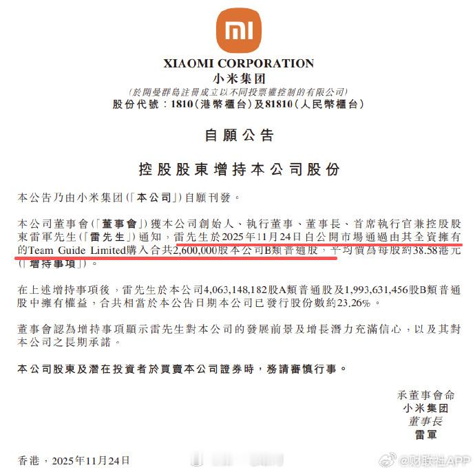 雷军斥资超1亿港元增持公司股份,持股比例升至23.26%
