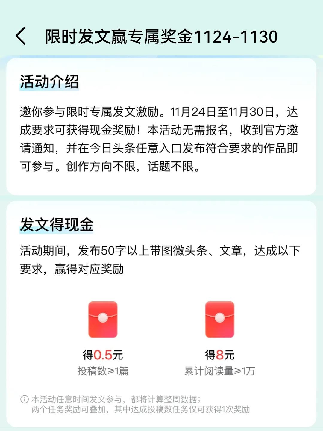新的一周头条的奖励活动又来了,不过这一周的活动奖励,更加低了,从之前连续两周的,阅读量每周累计≥1万,即可获得66元的现金奖励,到后来连续两周的阅读量累计≥5万,奖励50元,这一周的奖励是阅读量累计≥1万,奖励8元。 记得去年还有收益翻倍的奖励,今年已经变成固定金额的奖励,而且奖金越来越少了,每一周都在缩水。