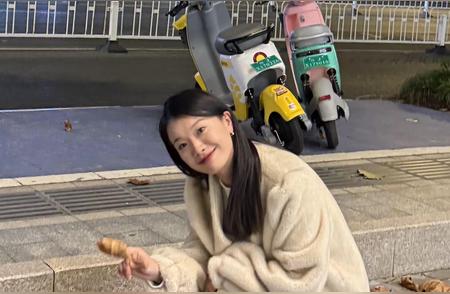 一袭裸色修身裙勾勒苗条曲线,米白开衫轻抚肩头添几分柔婉,粉色凉鞋与白色...