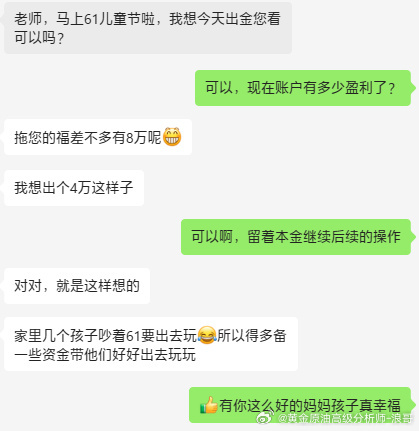 恭喜实盘何女士成功申请出金4万美金,留本金继续操作马上就是61儿童节了,相信很多家长都会趁着这个假期带着孩子,家人出去游玩,何女士也不例外,作为父母只想给孩子一切最好的东西,浪哥也心有神会,何女士短短半个月时间就以达到翻仓的条件,现以成功出金29万人民币,还有一些朋友账户正在积累着盈利,一切是盈是亏有没有这个实力带领大家在市场上获利我相信大家都有目共睹的!做投资盈利并不难,只要你伸手,心态放好,信任,你也可以向实盘的朋友们一样走向翻仓的一步