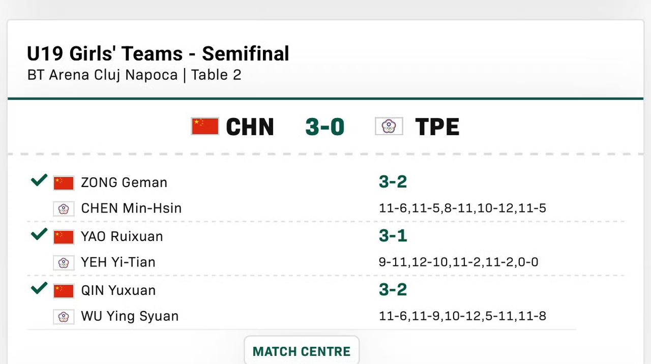 国乒U19女团晋级决赛[赞]! 今日凌晨两点多结束的一场2025世界青少年乒乓球锦标赛U19女团半决赛中, 🇨🇳中国女团3-0击败中国台北女团,晋级决赛! 第一盘,先胜两局的纵歌曼差点儿被对手翻盘了,还好稳住了决胜局,3-2险胜陈忞昕。 第二盘,先输一局的姚睿轩3-1战胜叶伊恬,尤其是第二局姚睿轩5-10落后,但她连续追分直达12-10,后面两局也都是11-2拿下。 第三盘,覃予萱和纵歌曼一样,也是先胜两局,又被对手扳平,最终决胜局拿下,3-2击败吴映萱。 国乒U19女团晋级决赛,成了国乒在世青赛上唯一的希望,因为在这届世青赛上,国乒U15男团输了意大利男团,U15女团输了日本女团,都止步了半决赛,国乒U19男团输了中国台北男团止步了八强赛。 国乒U19女团的决赛将在今晚午夜即11月26日零点开战,[奋斗]中国女团🆚日本女团🇯🇵 !