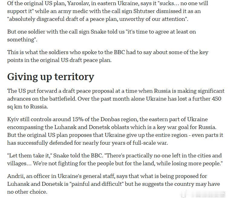 乌克兰第一副外长:日内瓦谈判,美乌制定的新框架,与“28条”差别很大,几乎没剩什么原先的内容…政治上最敏感的部分,留给两国总统决定指两个关键问题:俄军没占的乌克兰领土、安全保障的具体细节 乌东领土,还有15%,俄未能侵占。是否放弃,乌军内部也有争议,因为百姓已撤离,牺牲更多军人,保的是废弃的土地,虽然“痛苦”、也许“没有选择”。