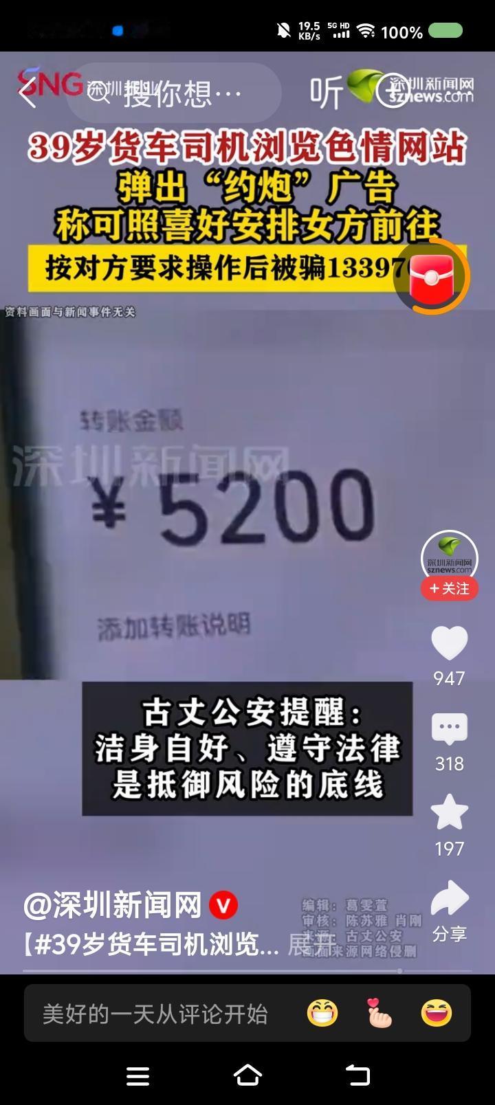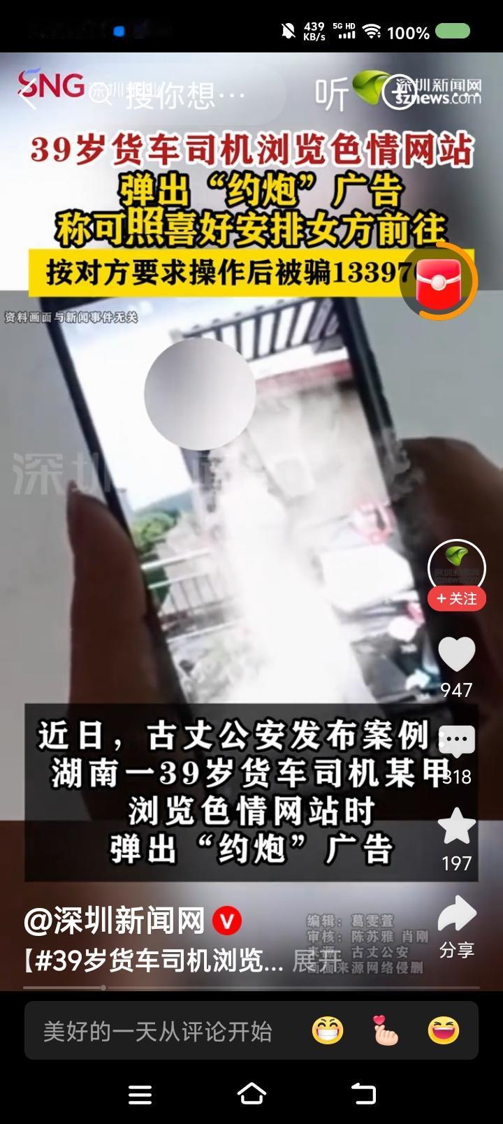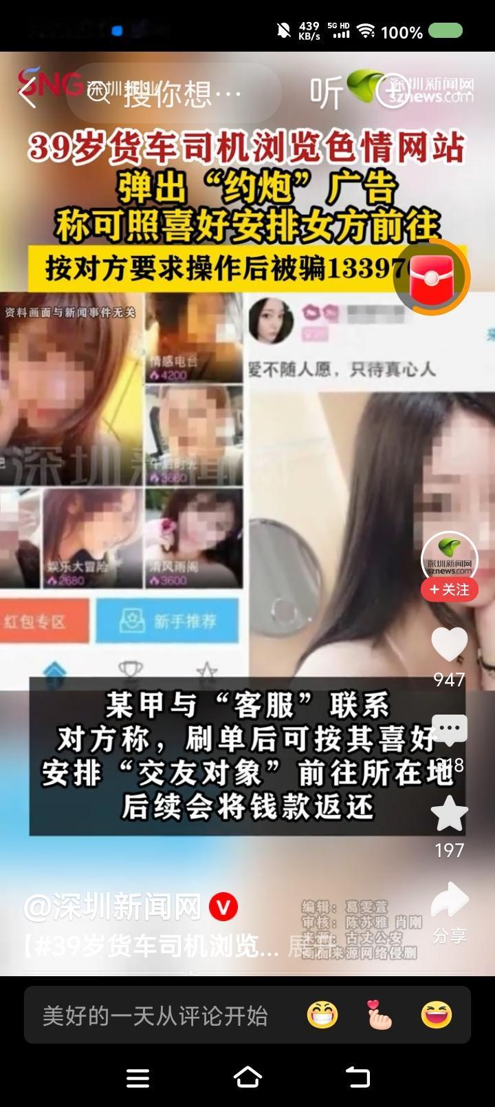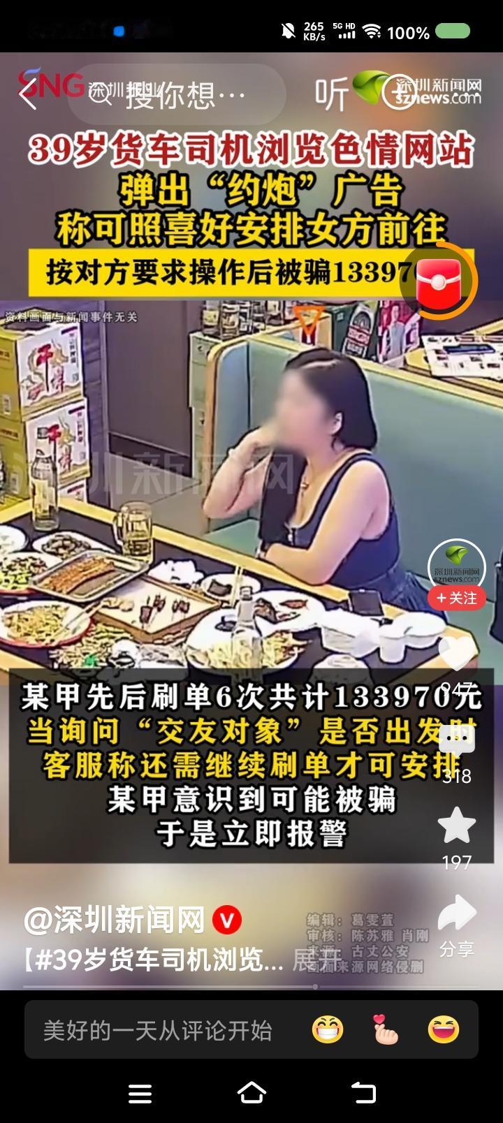 货车司机约Pao约了个寂寞!—— 据报道,一货车司机浏览颜色网站,弹出约Pao广告。他先后被引诱刷单多次,仍未约上,感觉被骗,报警。刷了6单,花了13万余元。 点评: 一、对方声称后期会返还,这是该男子上当的一个因素。 二、你知道我的第一反应么? 逗乐了。第二反应:司机有钱。第三反应:和谐社会,怎么还有这事?必须严惩!首先办该男子,这涉嫌Piao娼(未遂)。至于深挖非法网站及广告商,不言而喻。 我估计该男子会对警察说:“要讲诚信吧?走江湖也得讲规矩吧?我付钱了,你得安排吧?凭什么不安排?”警察气得不想理他!