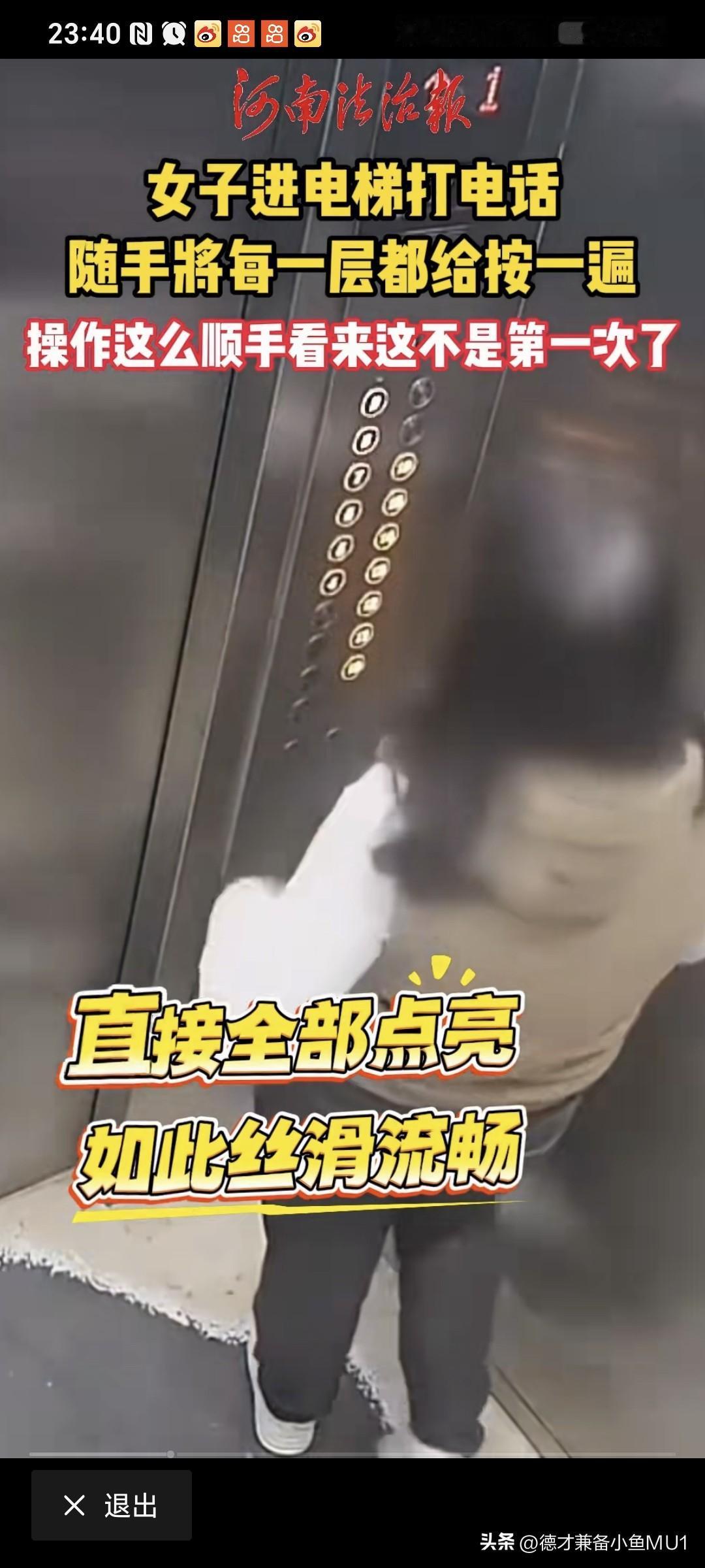 某小区电梯监控视频显示,一女子打电话进入电梯回家,随手将每层楼的按键都按了一遍,两排按键齐刷刷亮起。女子一边与朋友唠嗑,一边乘坐电梯,电梯每上一层就停一次。女子与朋友挂断电话时,电梯还没到她家,她又把自己之前按亮的楼层按键挨个取消。或许是为了不中断手机信号,她才想出这个办法,看她那熟练的样子,恐怕不止一次这么做了。 有什么重要电话不能进电梯前就接完呢?还是想拖延回家时间,怕家人听到通话内容不合适吗?肯定有些通话内容怕她老公知道,不然为何要冒着生命危险在电梯里打这么久电话。她本可以找个没人的地方接电话,怎料自己的人、声音和动作全被录下来了。 这样的人太过自私,物业真该拍下照片发到业主群,让她社死。