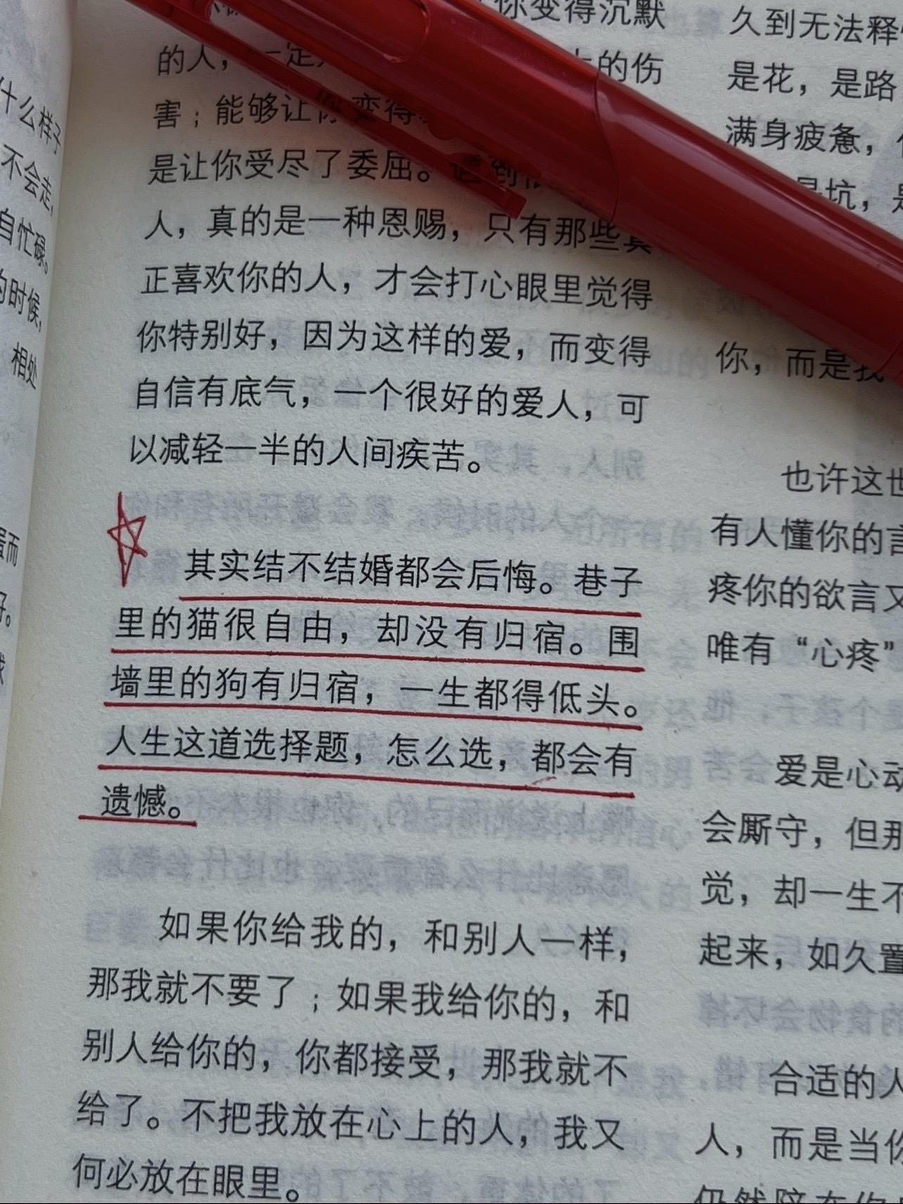 其实结不结婚都会后悔。巷子里的猫很自由,却没有归宿。围墙里的狗有归宿,一生都得低头。 人生这道选择题,怎么选,都会有遗憾。