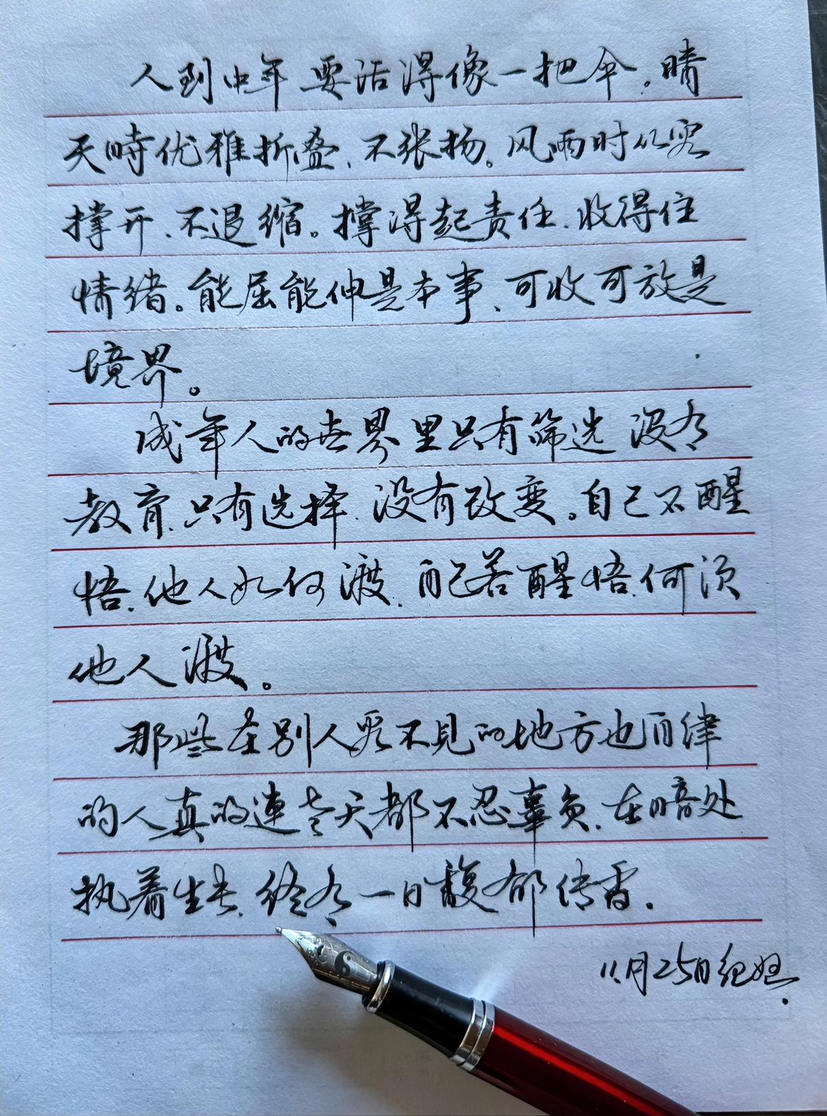 2023年5月开始涉及头条,什么都发,直至8月开始学着抄写加练字,历经两年半的时间,收获了很多人的支持,字也从不规范到还可以。 选择练字 从起初打发时间到没事就想抄抄写写,已经成为习惯。最初支持相伴的好友几乎都放弃了,而老太太我还在每天抄一篇发上来。 从起初看到收入的开心到很久不看一眼收入,流量爆款早已经不去关注。但是抄写中的每一笔仍然认真写认真琢磨。