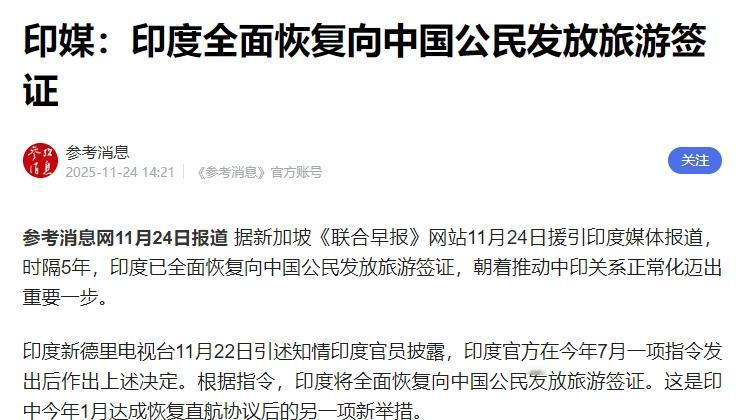 印度政府消息,11月24日,印度政府宣布在全球范围内全面恢复向中国公民发放旅游签证,这被看作是两国关系缓和的又一个重要信号。其实在今年7月,印度已经时隔五年重新开放了中国公民的旅游签证申请,但当时只能在北京、上海、广州等少数地方办理,现在总算扩大到全球所有使领馆都能办了。 自2020年那场众所周知的风波以来,中印之间的人员往来几乎陷入停滞,这五年里,我们的企业在那边遭受了什么,我们的APP是如何被封杀的,大家心里都有一本账。 如今,印度突然摆出一副“欢迎光来”的姿态,真的是因为他们想通了吗,这更像是一种迫于经济压力和现实考量的无奈之举。 早在7月,印度其实就已经悄悄撕开了一道口子,允许在中国境内的中国公民申请旅游签证,但那时候的动作极其谨慎,仅仅局限在北京、上海、广州和香港这几个特定的领事馆办理。 现在虽然名义上将办理范围扩大到了全球所有的印度驻外使领馆,但这仅仅是物理范围的扩大,核心的门槛不仅没降,反而高得离谱。 申请这个签证你需要提供的财力证明,不再是以前那种随随便便几千块的存款,而是被要求提供余额不低于10万元人民币的六个月银行流水。 在这个经济环境下,有多少普通年轻人愿意为了去喝一杯恒河水,特意压着十万块钱流动资金? 在这个数字化高度发达的2025年,东南亚国家恨不得把二维码贴到我们脸上求我们扫码入境,印度却依然坚持那一套古老而傲慢的官僚作风——没有电子签。 11月10日,印度的靛蓝航空率先开通了德里到广州的航线,明年2月印度航空也计划恢复新德里到上海的直飞。 但这几条稀疏的航线,对于两个拥有十亿级人口的大国来说,简直是杯水车薪,看看票价,再看看航班频率,完全没有恢复到疫情前那种便捷程度。 这种恢复更多是基于商业利益的考量,毕竟他们的航空公司也需要赚钱,需要利用中国的枢纽把人送到北美去,这并不代表他们在战略上对我们有多么友好。 印度在边境问题上搞小动作,在经贸领域打压中国企业,这些“硬伤”并没有因为几张旅游签证的恢复就自动愈合。 一个连基本的营商环境都无法保障,动不动就对外国企业“关门打狗”的市场,对于游客的安全保障又能有多少信誉度? 现在的印度旅游业,无论是基础设施、卫生条件,还是针对中国游客的服务体系,比如中文导游、中餐供应,都存在着巨大的断层。 在这种情况下,花着去欧洲的钱,受着去探险的罪,还得看人家的脸色,这笔账怎么算都不划算。 最后想问问大家,如果让你必须压十万块钱在银行卡里,还得请假专门飞一趟北上广去送材料,就为了去一趟印度,你会觉得这是真爱,还是脑子进了恒河水? 信息来源:参考消息