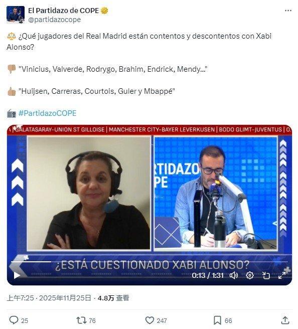 【科贝讨论】哪些皇马球员对阿隆索感到满意或不满?👎🏽不满: “威尼修斯、巴尔韦德、罗德里戈、卜拉欣、恩德里克和门迪……”👍🏽满意: “赫伊森、卡雷拉斯、库尔图瓦、居莱尔和姆巴佩。”