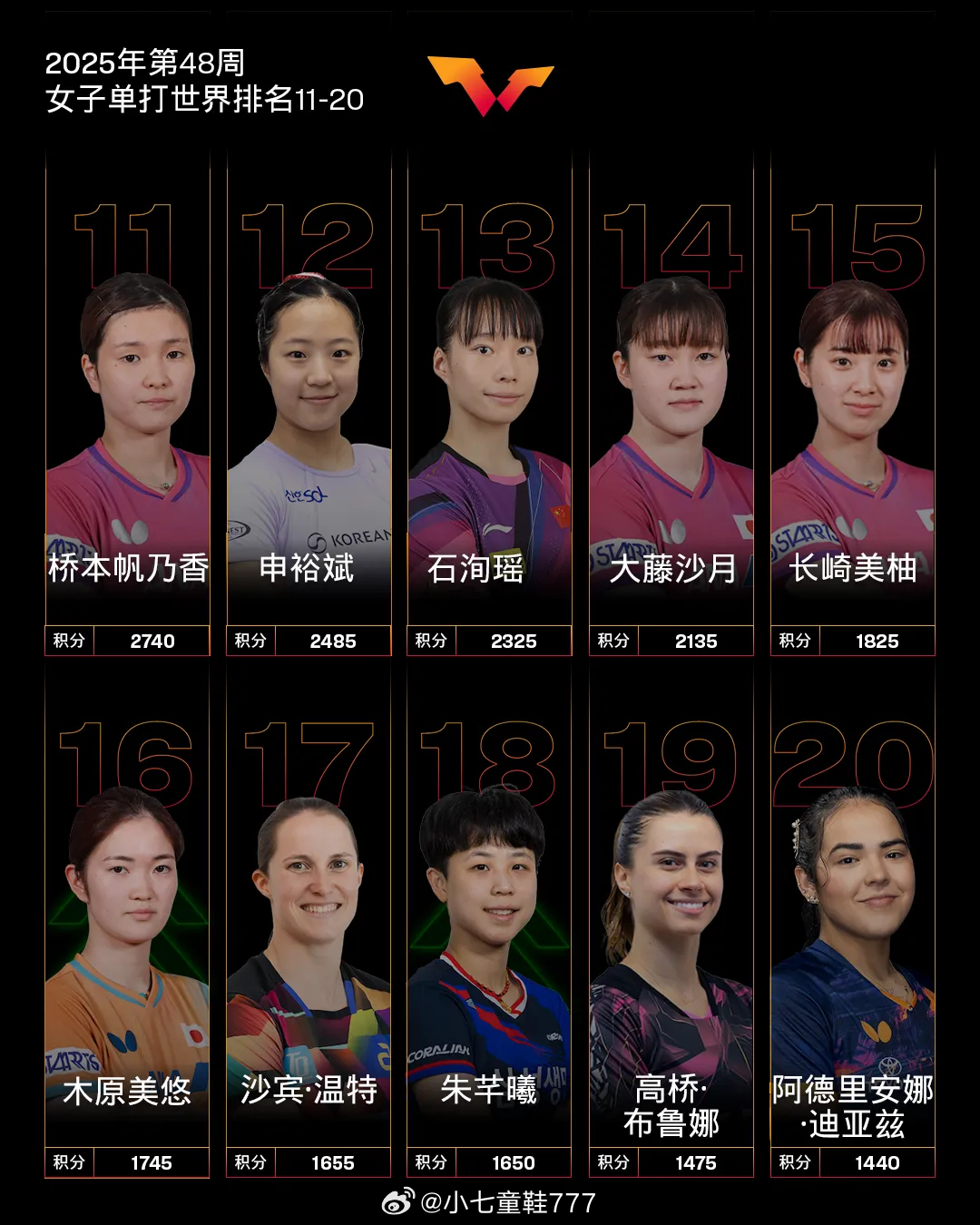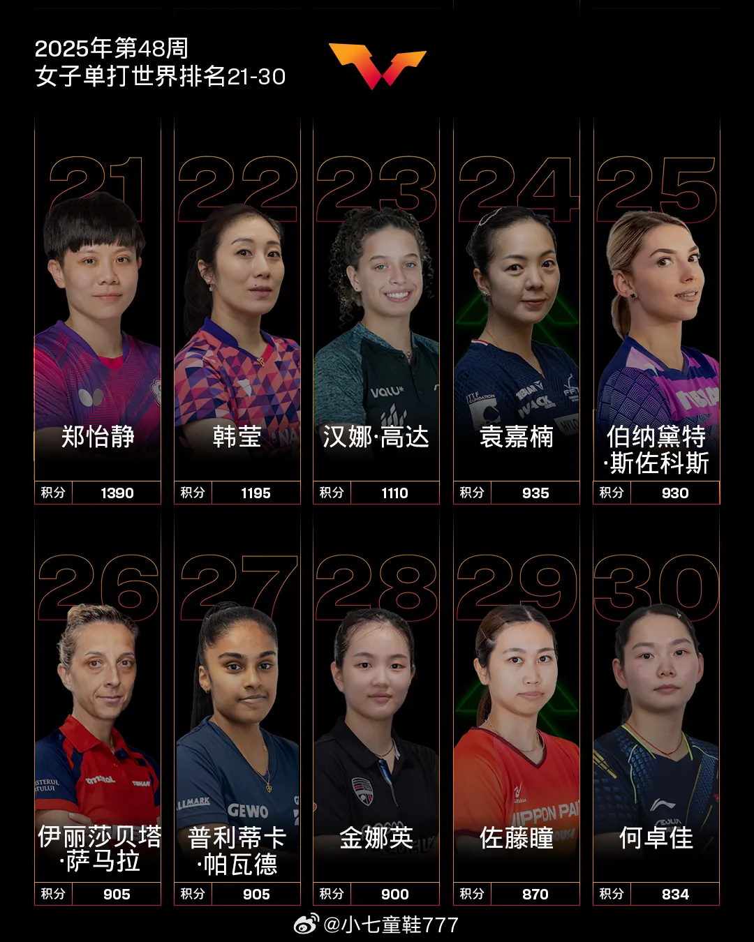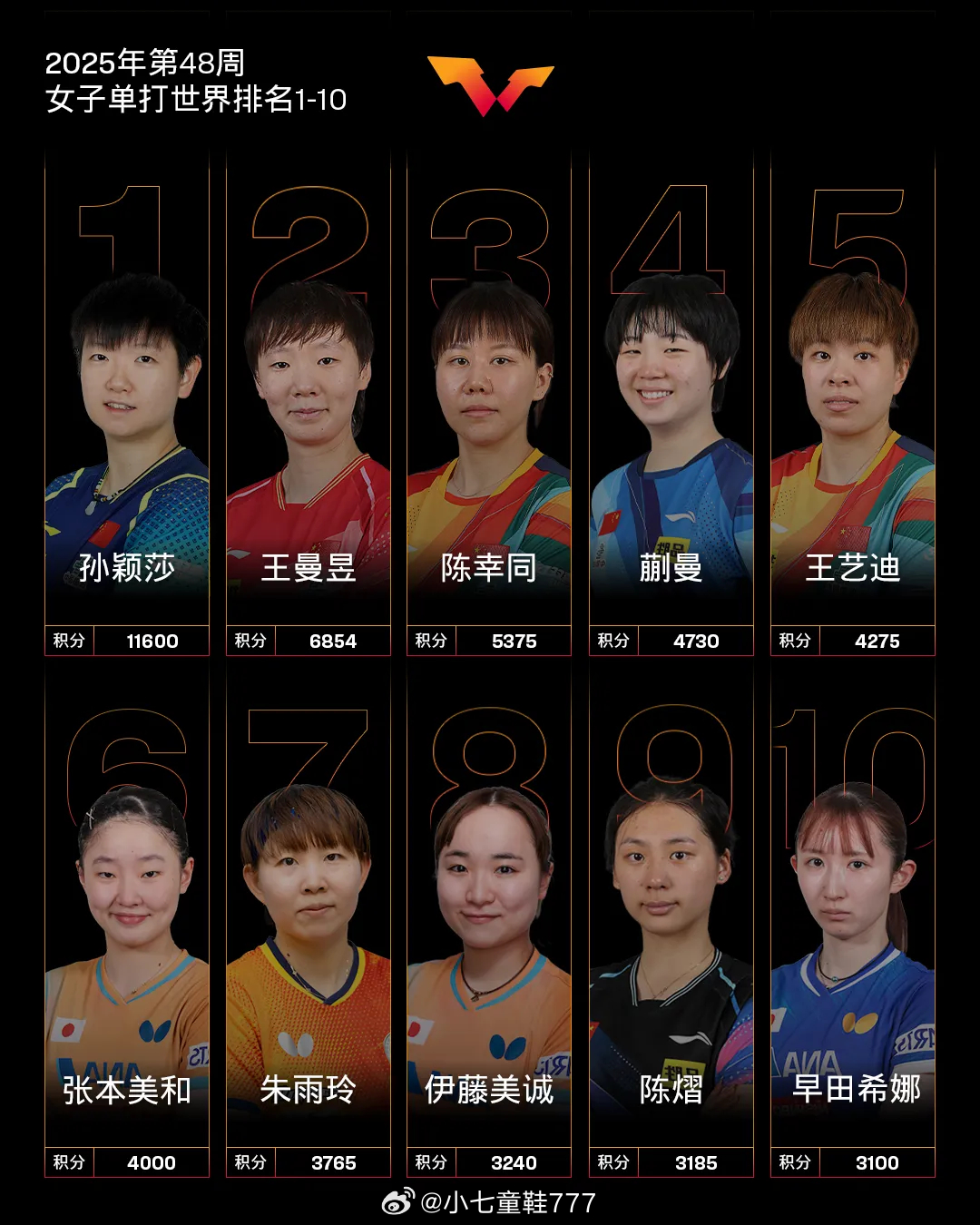 国际乒联公布2025年第48周排名,女单方面,中国队球员孙颖莎以11600分连续第176周霸榜第一,目前,孙颖莎已在职业生涯中斩获17个世界冠军头衔。王曼昱、陈幸同、蒯曼、王艺迪位列前五,陈熠位列第九。石洵瑶排名第13,何卓佳排名第30,覃予萱排名第35,钱天一排名第37,王晓彤排名第42。
