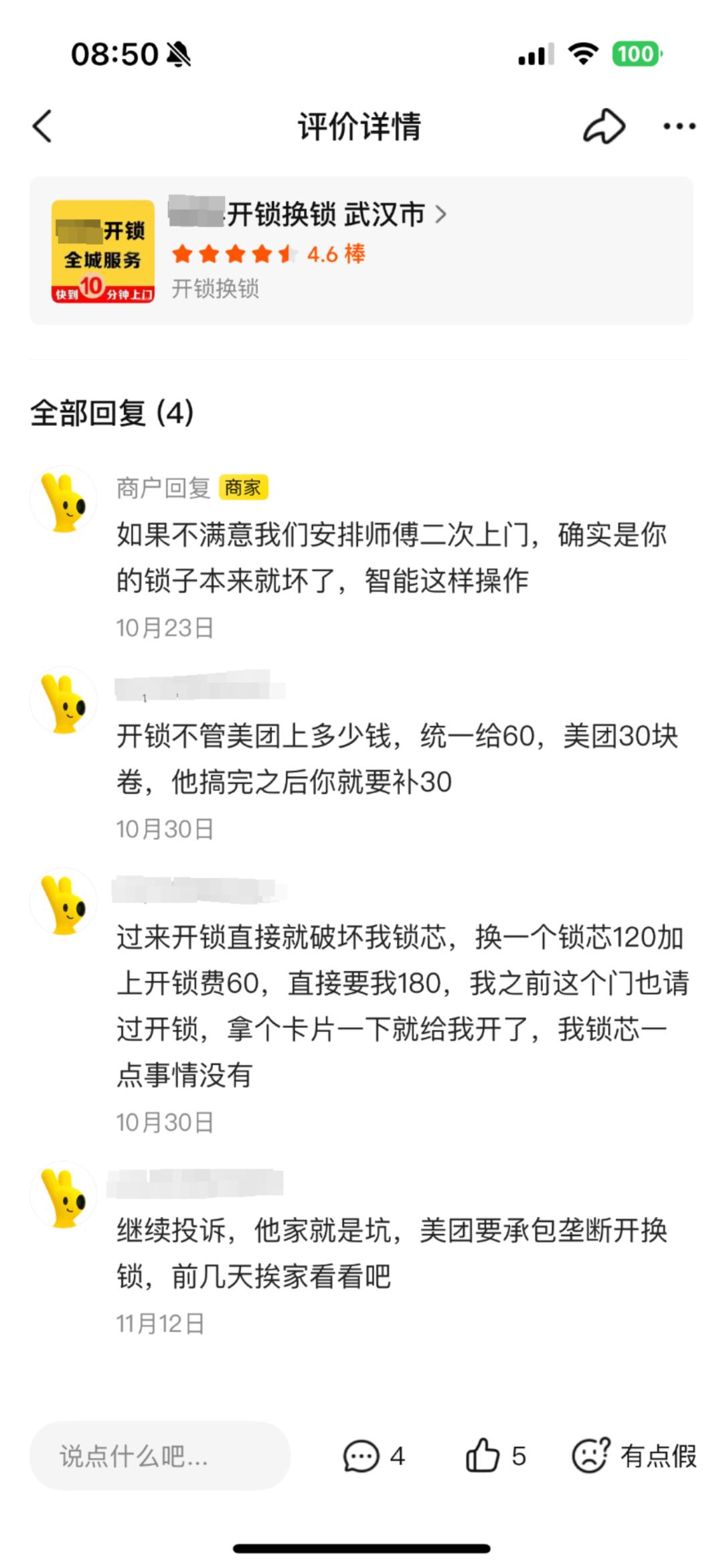 近日,湖北武汉的殷女士通过美团平台预约上门开锁服务,原本紧急的求助却演变成一场冲突闹剧。起因是 6 岁孩子不小心反锁卫生间门,殷女士联系平台置顶商家后,对方承诺上门加开锁共 60 元,15 分钟后两名男子抵达现场。 然而,开锁师傅查看后称工具被锁损坏,需拆卸换锁,费用骤升至 500 元。殷女士夫妻决定更换服务商,同意支付 60 元上门费,但坚持通过平台付款,拒绝师傅要求的私人微信转账。争执之下,一名师傅突然踹向卫生间门导致门套损坏,殷女士丈夫阻拦时双方发生肢体冲突,最终其左胸腹部及左手受伤。 报警后殷女士得知,这两名开锁人员并未取得公安备案资质。更令人无奈的是,商家以签订 “免责协议” 为由撇清关系,美团仅提出补偿 600 元心意金,未明确对商家的处理方式,而殷女士的医药费、换门费等损失已超 2600 元。据悉,涉事商家此前就有 “强制换锁、漫天要价” 的类似投诉,目前当地派出所已立案调查。