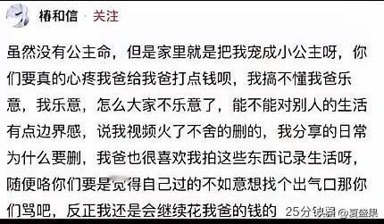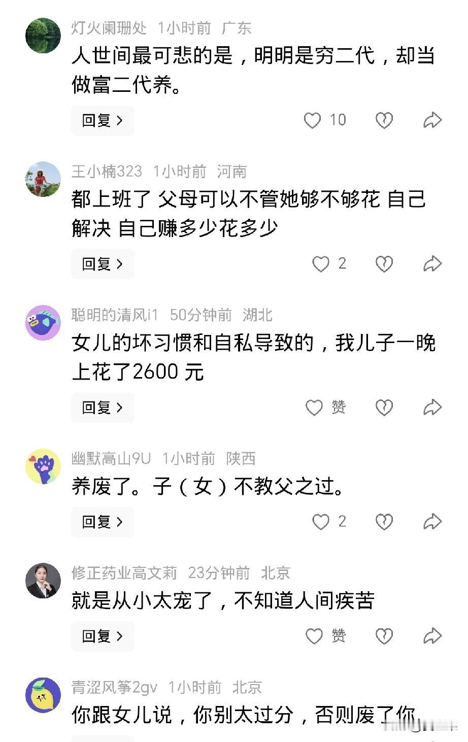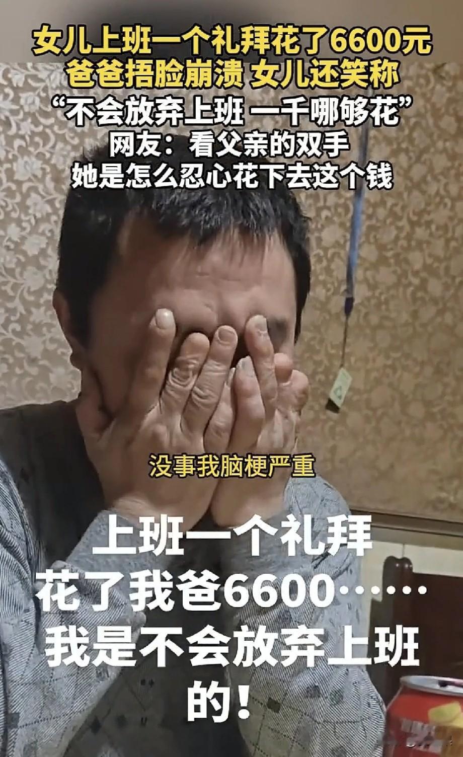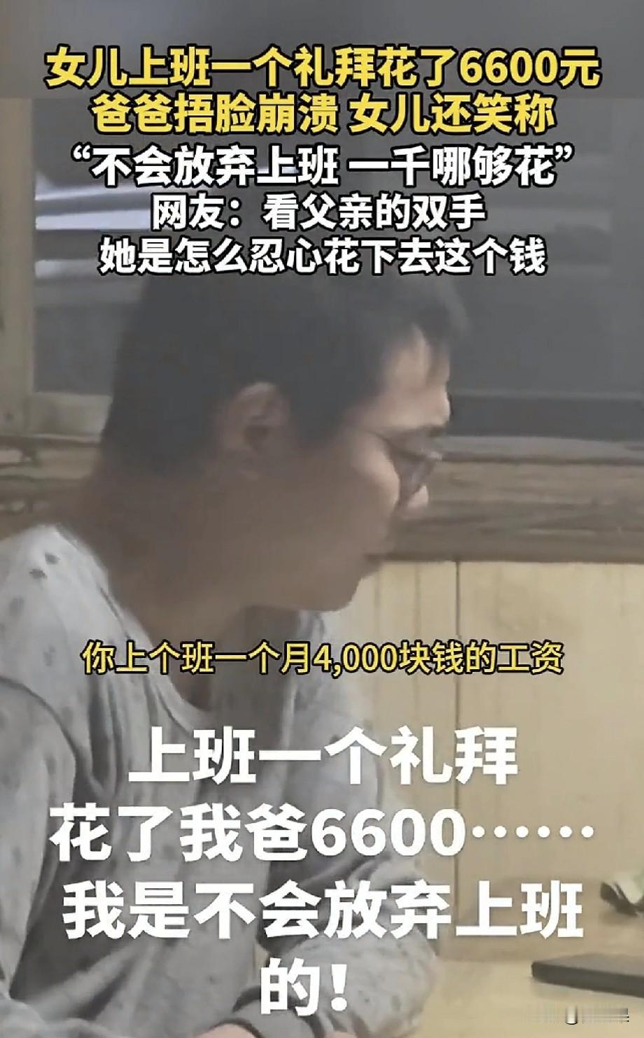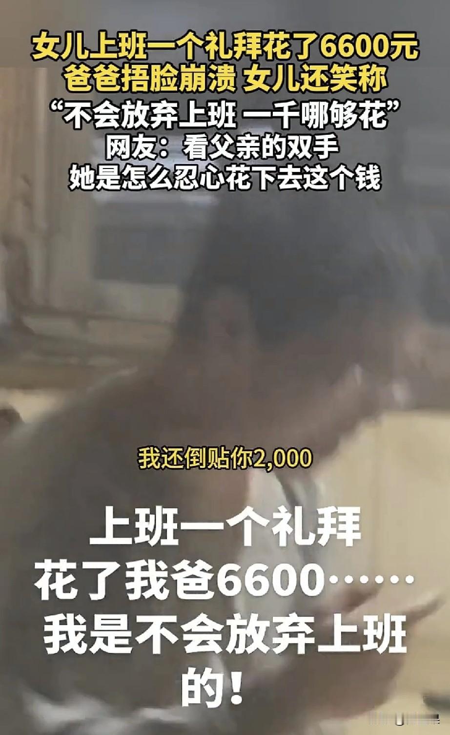 一个愿打一个愿挨, 这个姑娘说得对,就是她花光了父母的钱,人家老爸就是宠女儿,外人说那么多干啥? 最近一位女生说,她上班月薪4000刚上一周,工资还没发,就花了6000了。 她开玩笑跟她爸说这事, 她爸一副欲哭无泪的表情,说让她上班,没想到还得倒贴2000。 这个女生始终当个玩笑,可是网友们看到她爸短缺的手指头,却不乐意了。 看看她爸残疾的手指头,看看家里的摆设,怎么也不像一周花掉6000的家庭啊。 于是纷纷指责女生不体谅父母,乱花钱。 可是女生也不乐意了,讨厌别人乱叨叨。 这个女生是真不知道柴米油盐贵,虽然说穷养儿富养女,可是穷人家庭富养女儿则养成了娇惯的大小姐。 就怕是小姐身、丫鬟命,能掩盖住一时,骗不了一世啊。 由俭入奢易,由奢入俭难。 现在一星期花6000,以后呢?但凡低于这个标准就会浑身不舒服。她终归会从云端掉下来。 这个女生最后还说,已经辞职了,大概嫌工资少,辞职原因还是打着爷爷脑梗严重的名号。 无语,真是养孩子养废了。