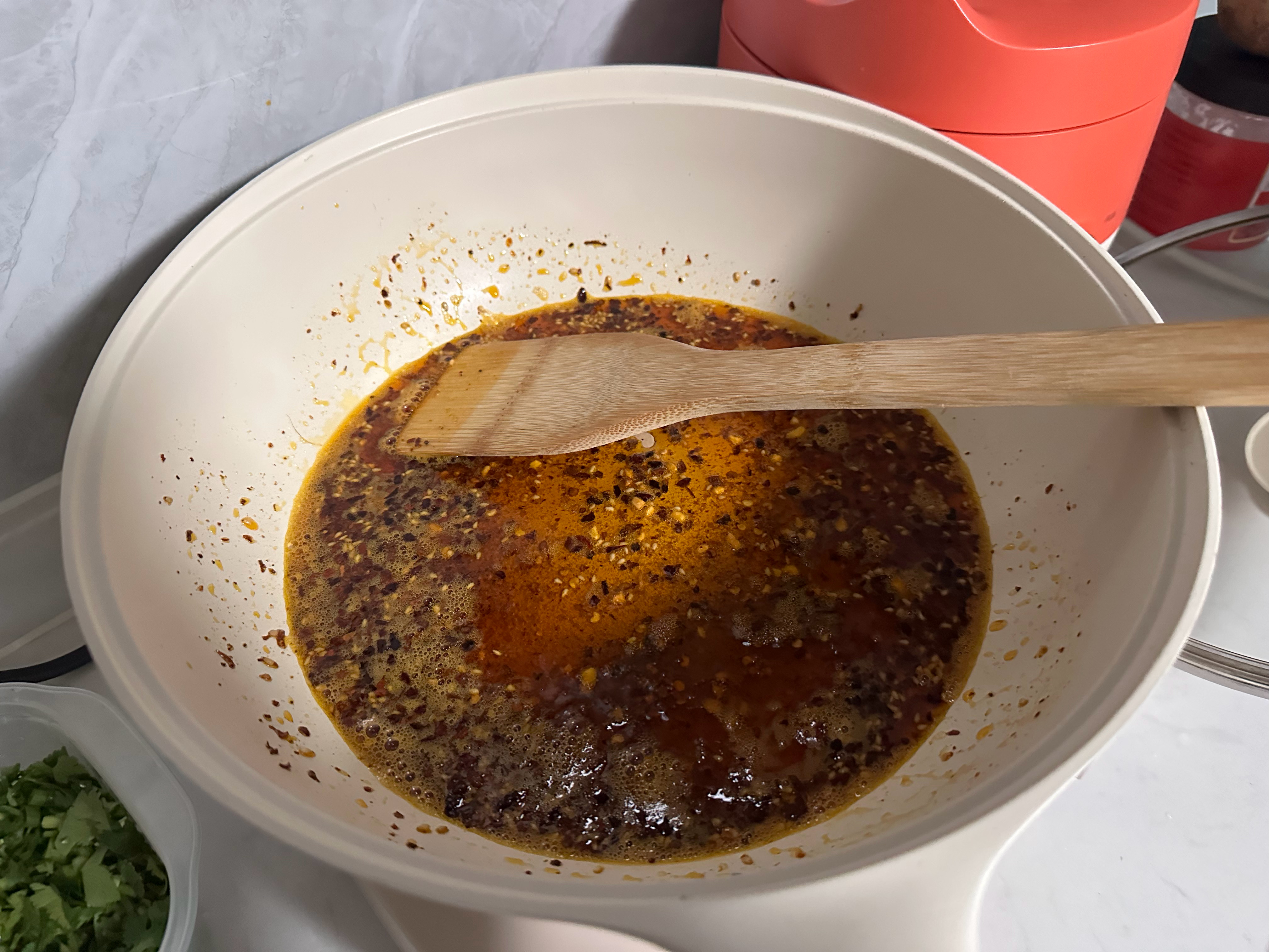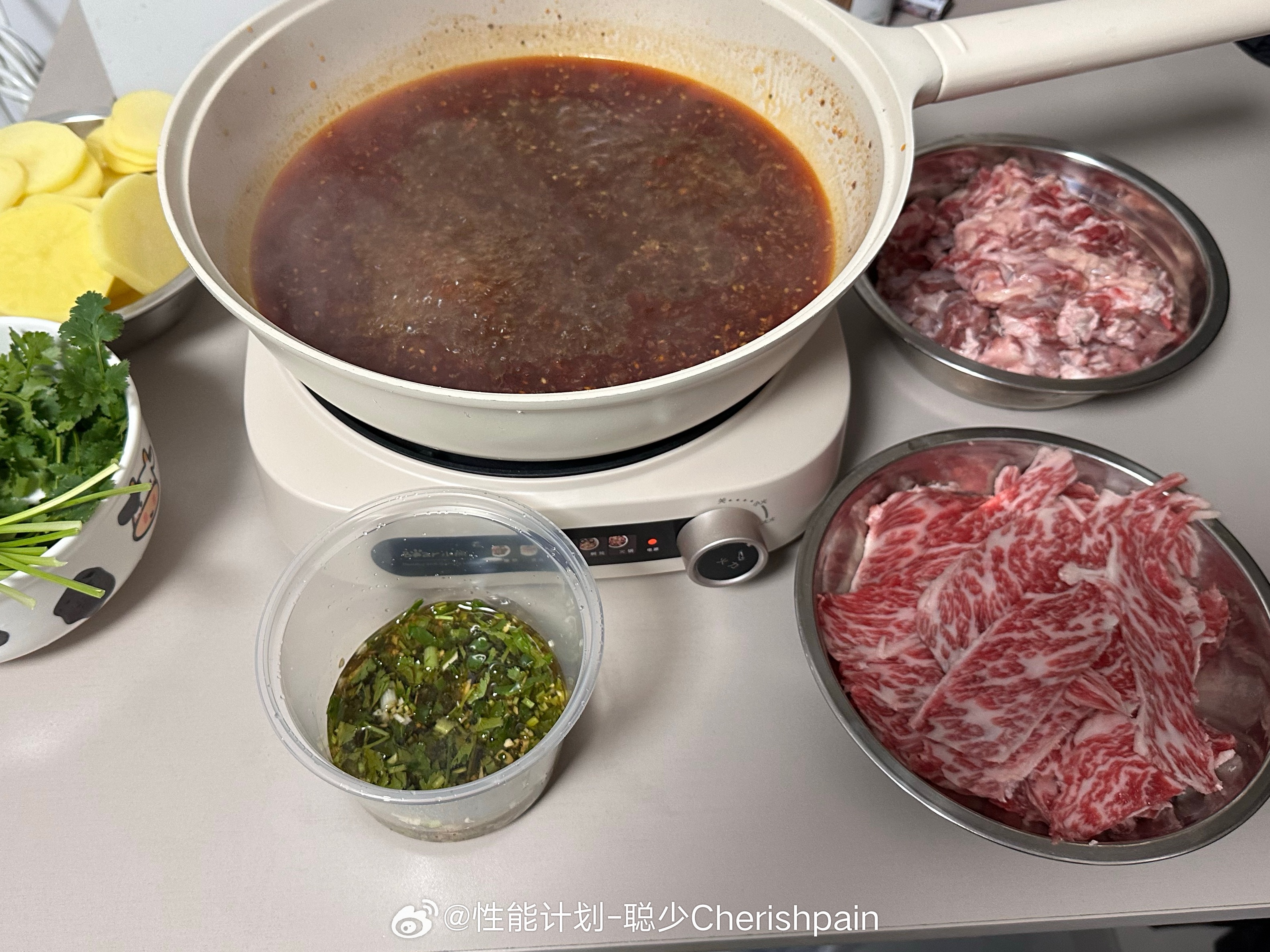 买的火锅底料,煮之前如果猛炒一下锅底将会特别香,我作为Real Chef,必须露一手 这白花花的进口和牛,冷白皮里透红,简直让人欲罢不能