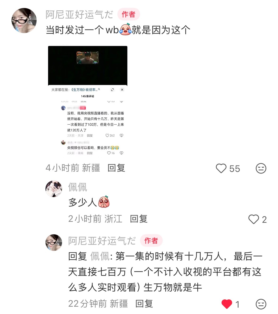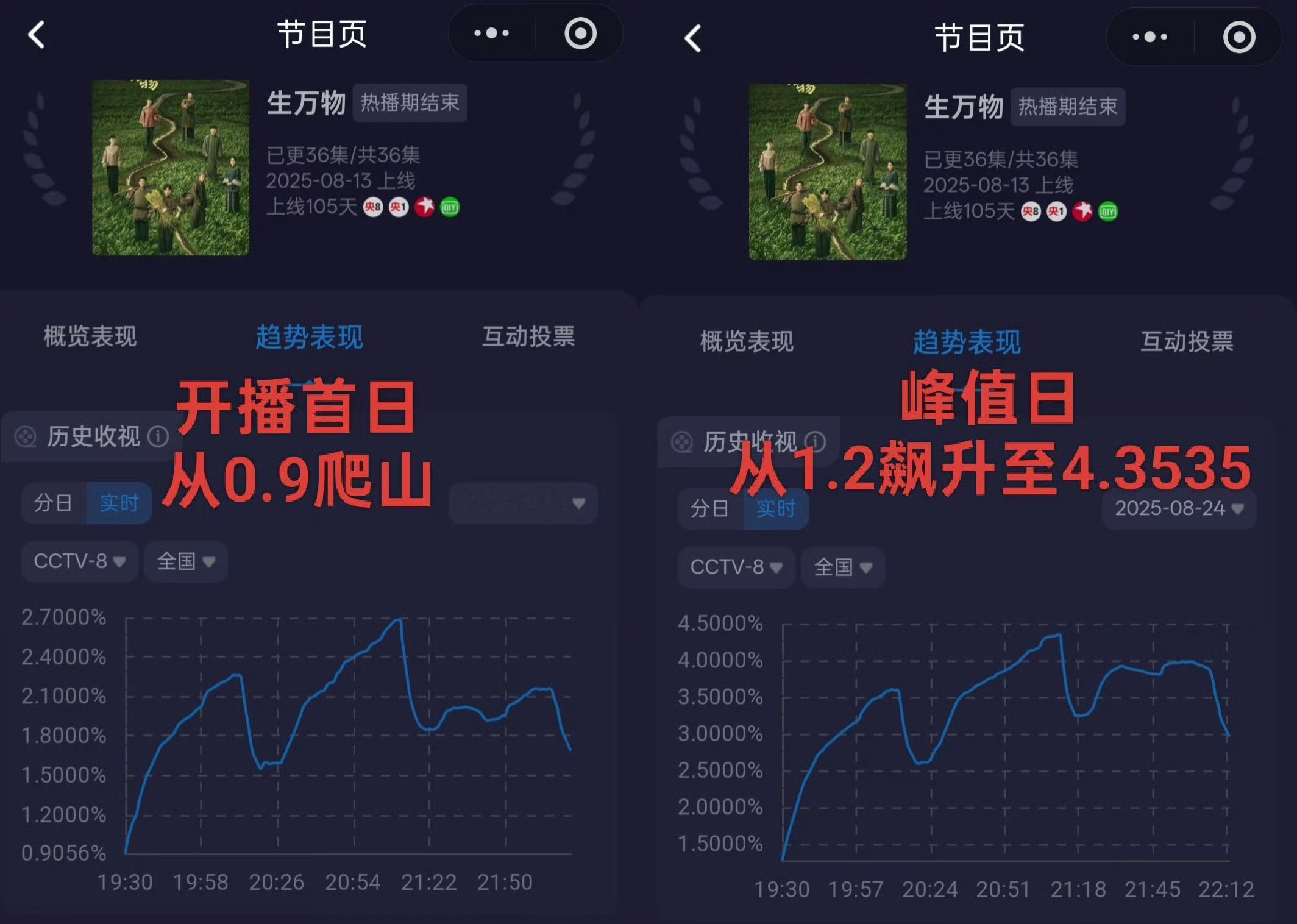 俺们生万物大结局那天央视频app有700万多人观看,从开播十几万人到700多万人翻了几十倍,而这都不计入央八收视的《生万物》牛就牛在开播当天从0.9爬坡,峰值那天也只从1.2爬坡后飙升到4.3535的。11天的播映时长,愣是把观众牢牢抓住剧迷越来越多。剧王伟大!