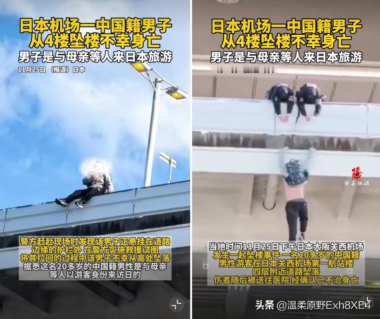 真是有点奇怪,20多岁的中国小年轻,陪妈妈去日本旅游,却独自坐到了航站楼的护栏上?而两名救援人员都拉着他的手了,他却突然坠落! 据网友拍摄的图片显示,小伙面部朝下倒在马路边,当时已处于昏迷状态。更不幸的是,在送往医院后,小伙确认身亡! 目前都还不知道啥原因,日本警方也在调查中。