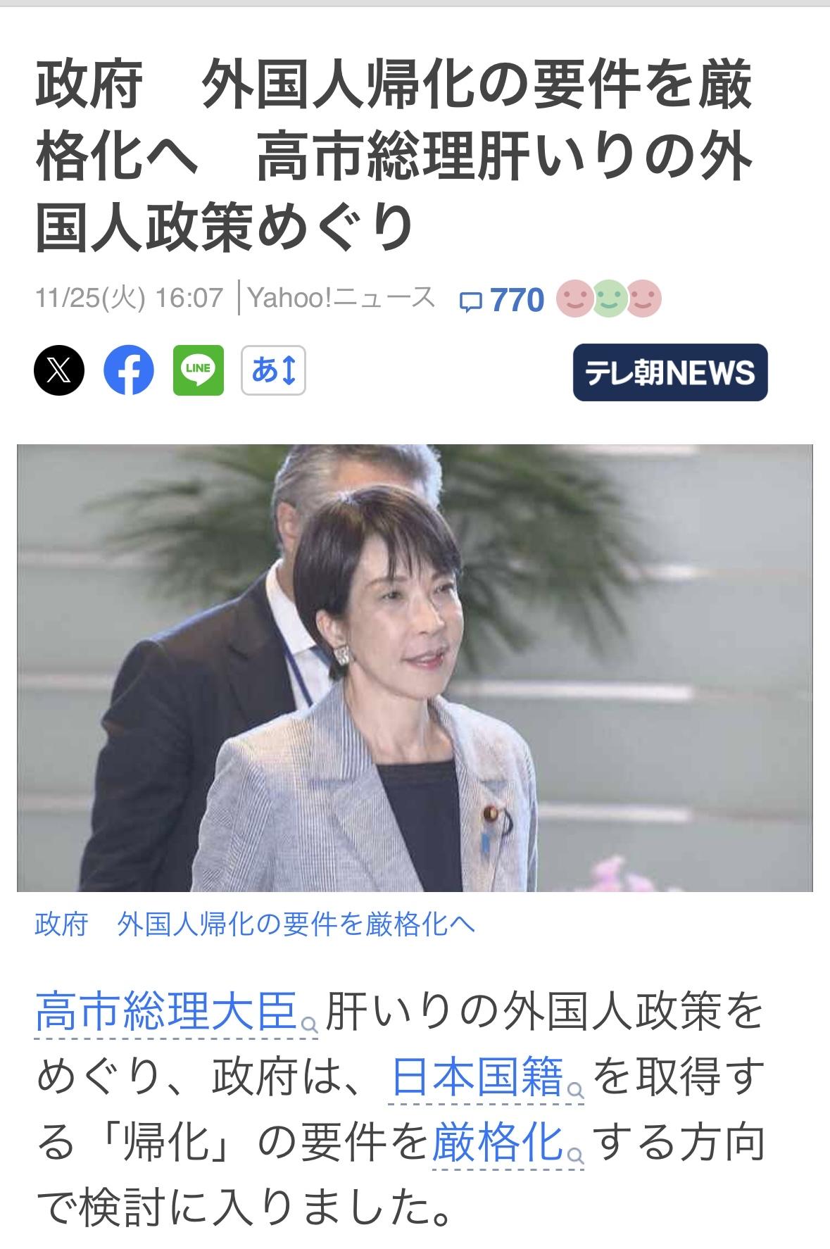日本政府收紧入籍条件,即获得日本国籍的条件。政府内部有人质疑入籍条件,赋予公民投票权比永住更为宽松,正在考虑将入籍居住年限要求延长至十年以上等方案。 高市已指示相关内阁大臣在明年一月前制定外国人政策基本方针,政府目前正在研究具体措施。