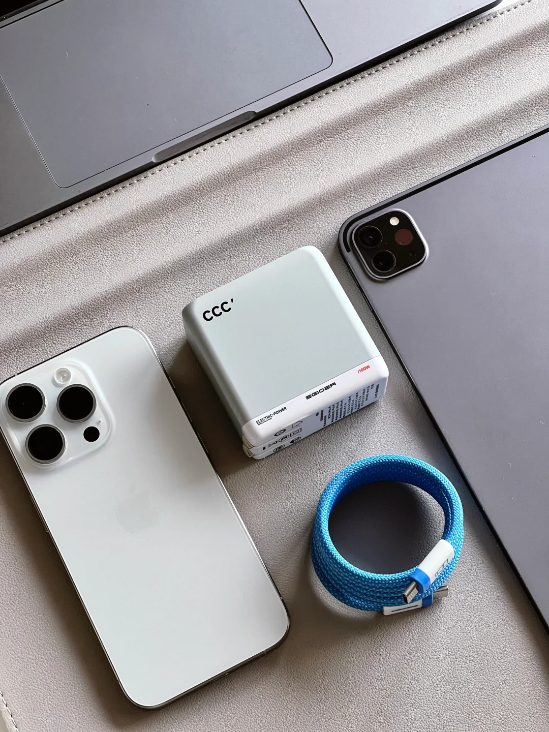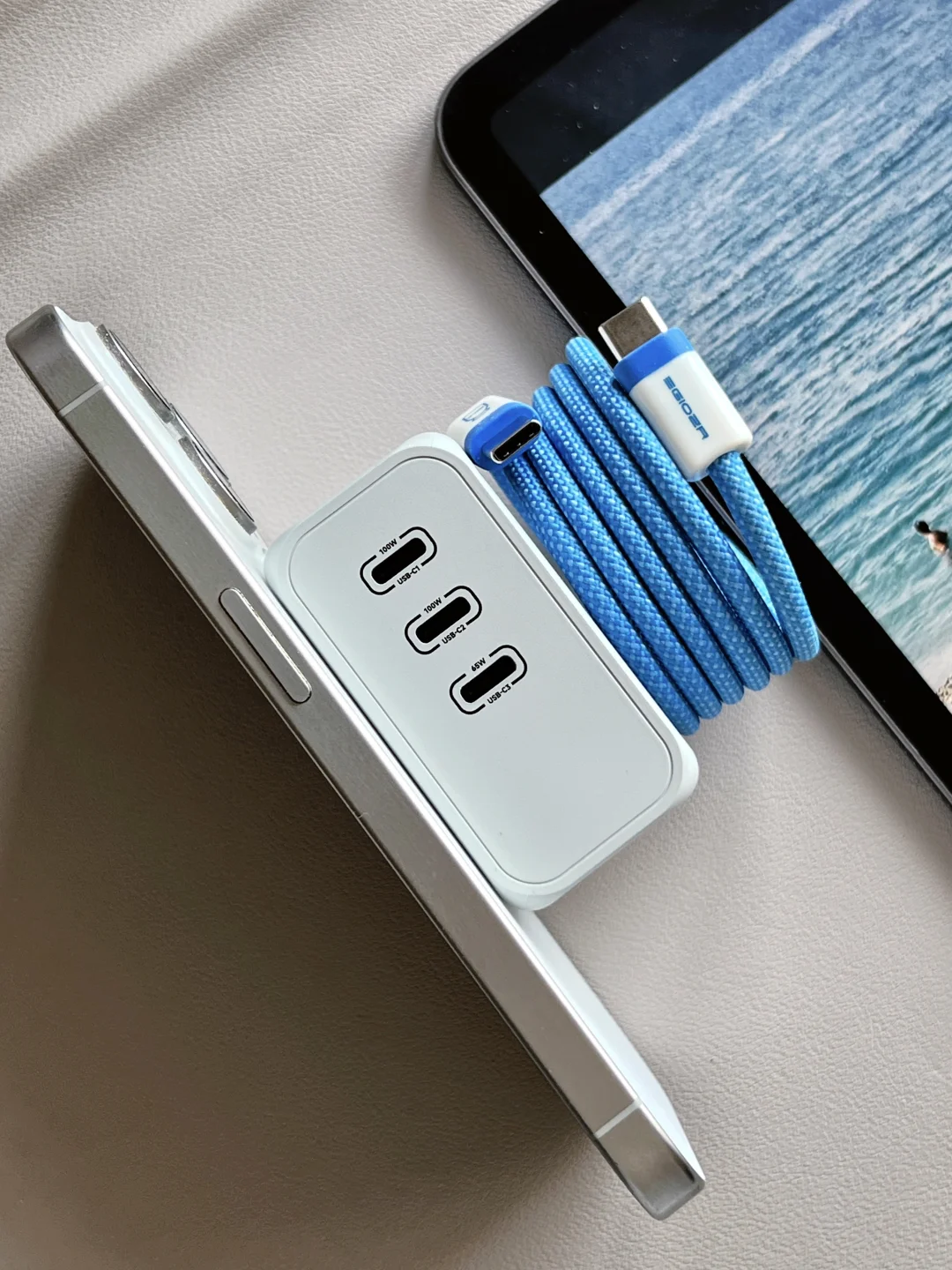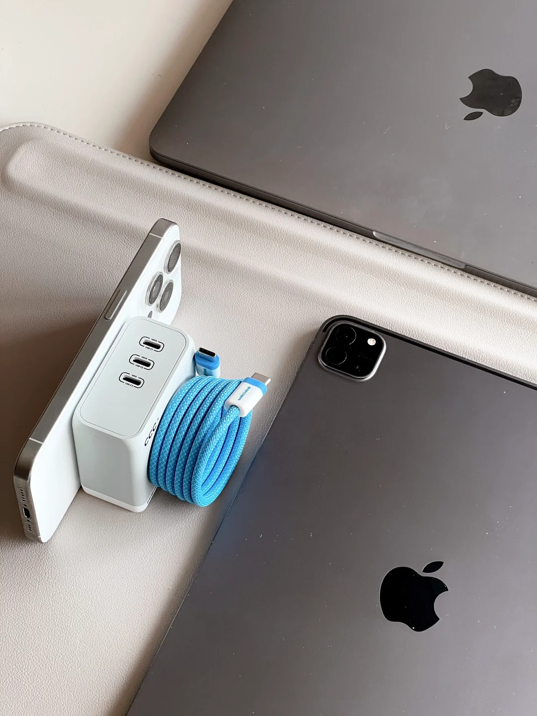书桌上这颗100W的氮化镓快充, 真的太省心了! 三个独立快充口, MacBook Pro、iPad Pro、iPhone能同时满速回血,搭配磁吸全能线,桌面变整洁了~ 随手一插就充电,告别各种杂乱的充电头。 出差旅行也能随身带,苹果全家桶用户真香了~!