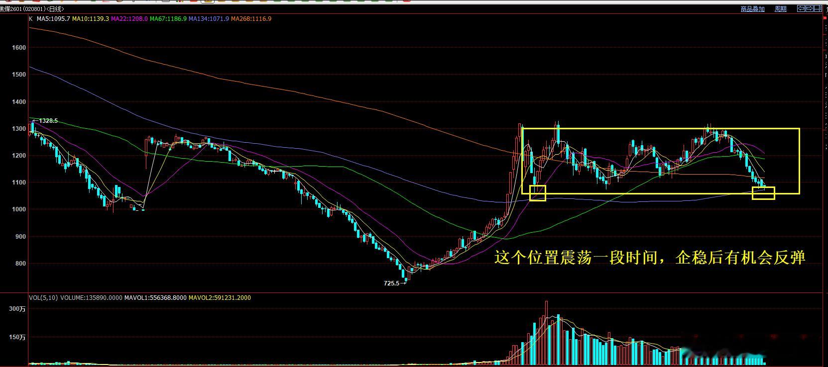 仔细看图解,焦煤在前面回调下沿部分震荡一段时间,企稳后有反弹机会,但需要一点时间