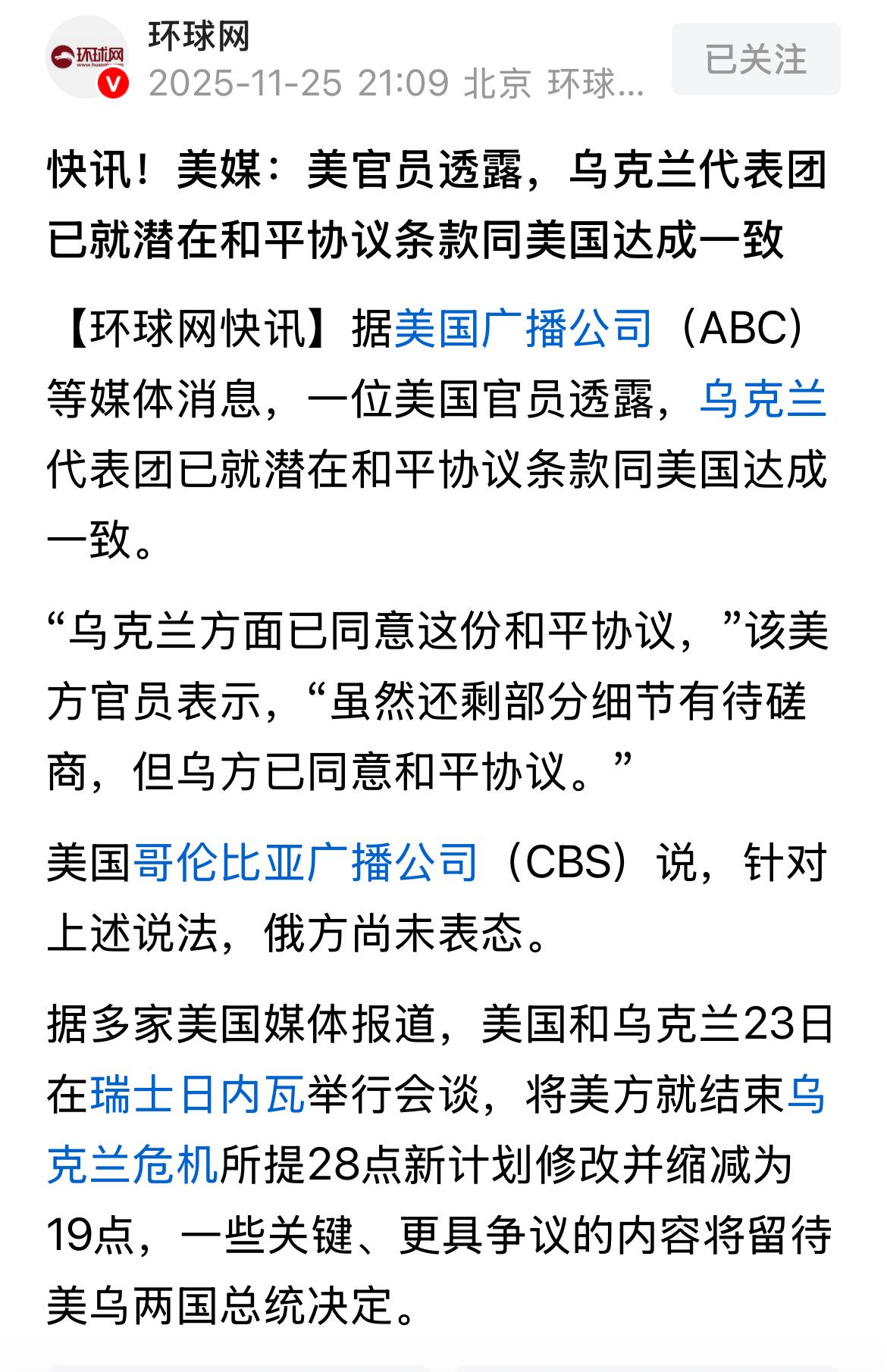 乌克兰的大结局将至! 当地时间11月25日消息显示,乌克兰已在原则上同意美国所提出的和平协议,不过部分条款仍待进一步讨论。乌克兰国家安全与国防委员会秘书乌梅罗夫称,乌美已就核心条款达成一致,且期望泽连斯基能在11月尽早访美,以完成最后的程序。 此前,美国媒体曾曝光特朗普政府起草的结束乌克兰危机28点新计划,经美乌会谈后减至19点。与此同时,美国陆军部长率领的代表团在阿布扎比与俄罗斯代表团举行了会谈。 目前,俄罗斯和欧盟均未给出回应。用一句话来形容当下的乌克兰,小弟就是用来被出卖的,乌克兰被彻底出卖了。再瞧瞧亚洲的美国傀儡们,却还在做着白日梦!