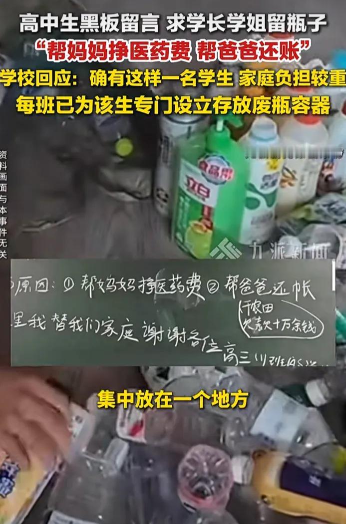 高中生黑板留书求“瓶”:在困顿里开出担当之花…… 一块黑板,几行粉笔字,写尽了一个高中生的担当与无奈。“帮妈妈挣医药费,帮爸爸还账”,这位高中生在黑板上留言,恳请学长学姐把废瓶子集中存放,好让他能靠卖瓶换钱,为家庭分忧。学校回应确有此事,还为他在每班设立了存放废瓶的容器。 很难想象,在本该一心扑在学业、憧憬青春的高中年纪,他却要为家里的医药费和债务操心,把目光投向一个个废塑料瓶。那不是普通的瓶子,是他为妈妈续上的药费希望,是帮爸爸卸下的债务重担,是一个少年用稚嫩肩膀扛起家庭责任的倔强。他在黑板上小心翼翼地请求“学生会看到别扣分”,字里行间满是懂事,却也透着让人心酸的沉重。 幸运的是,学校和同学们用行动给了他温暖的回应。每班设立专门容器,这不仅仅是给了他收集瓶子的便利,更是给了他一份尊重和支持。没有居高临下的施舍,而是用一种体面的方式,让他能靠自己的努力为家庭付出。这份善意,保护了他的尊严,也传递了校园里最动人的温度。 一个孩子要靠捡瓶子来支撑家庭,这背后是多少现实的无奈。我们常说“少年不识愁滋味”,但对他而言,生活的愁绪早已压在肩头。这也让我们看到,在一些角落,还有这样的家庭,在疾病和债务的夹击下艰难喘息,而孩子过早地承担了本不该属于他的重量。 不过,这个孩子的担当又如此耀眼。他没有沉溺于困境,而是主动寻找能做的事,用自己的方式去抗争生活的难。这份勇气和责任感,比那些空泛的“成熟”更动人。 各位读者你们怎么看?欢迎在评论区讨论。