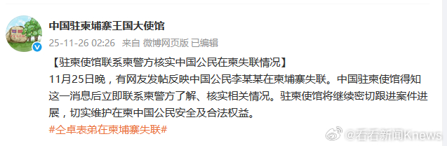 【:将密切跟进】据 11月26日消息,11月25日晚,有网友发帖反映中国公民李某某在柬埔寨失联。中国驻柬使馆得知这一消息后立即联系柬警方了解、核实相关情况。将继续密切跟进案件进展,切实维护在柬中国公民安全及合法权益。