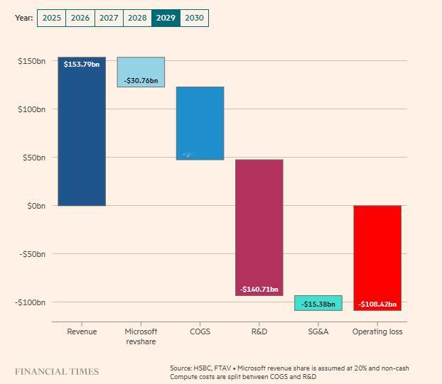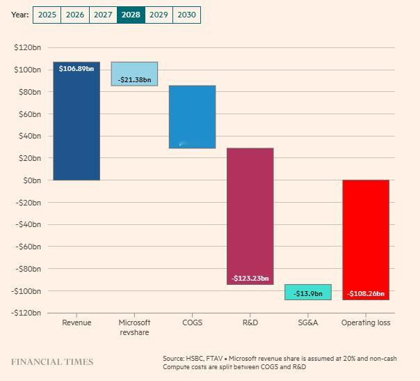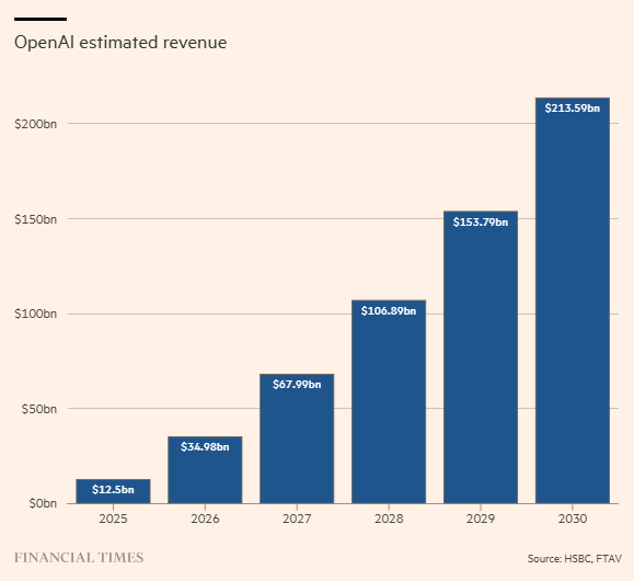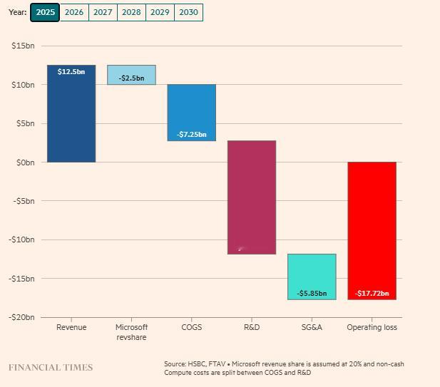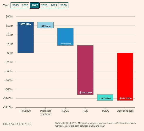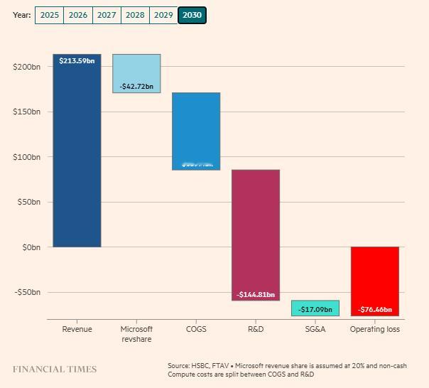汇丰估算,为了维持亏损运营至2030年,OpenAI至少需要再融资2070亿美元海外新鲜事 金融时报报道说,OpenAI是一个“烧钱机器”,外表只是一个网站。这一点已经众所周知。但由于OpenAI是私人公司,要估算究竟烧了多少钱,还需要大量猜测。汇丰银行美国软件与服务团队今天更新了他们对OpenAI的模型,将10月底宣布的与微软达成的2500亿美元云计算租赁协议、以及不到一周后宣布的与亚马逊的380亿美元云计算租赁协议纳入其中。这两笔最新交易为OpenAI带来了额外4千兆瓦的计算能力,使签约总量达到36千兆瓦。根据这些交易的累计总额最高可达1.8万亿美元,OpenAI的数据中心租赁费用预计每年约为6200亿美元。为海外华人提供有价值的信息与分析,更多内容和全文可在蓝天、电报、x查找causmoney,或直接谷歌搜索不过,到2030年底,预计仅有三分之一的签约算力将上线使用。为了评估OpenAI的支付能力,汇丰团队首先建立了一个收入预测模型。他们的出发点是将用户数量放入S型增长曲线中,到2030年达到30亿,相当于除中国外全球成年人口的44%。而截至上月,用户总数估计约为8亿。广告、具备自主能力的AI、甚至可能还有乔尼·艾夫的项目(前苹果首席设计师乔尼·艾夫与OpenAI合作开发的硬件项目),预计到本十年末都能为收入做出贡献。但目前的业务模式,主要是劝说用户订阅付费服务。汇丰表示,大型语言模型(LLM)的订阅服务将“像Microsoft 365一样普遍且有用”。他们预测到2030年,10%的OpenAI用户将成为付费用户,而目前的比例估计为5%。团队还假设,LLM公司将从几乎为零的基础增长,获得数字广告市场2%的收入份额。这将带来爆炸式的收入增长:……但成本也会同步上升,这意味着OpenAI预计在整个2030年代初期仍将补贴用户使用。……也就是说,OpenAI未来的每一轮融资,基本都将用来为数据中心输送现金:汇丰在估算时所依据的一些假设包括:到2030年,消费级AI收入总额将达到1290亿美元,其中870亿美元来自搜索,240亿美元来自广告。OpenAI的消费市场份额将从今年的约71%下降至2030年的56%。Anthropic和xAI的市场份额都将维持在个位数,一个未明确的“其他”类别占22%,谷歌则被完全排除在外。企业级AI到2030年将产生3860亿美元的年收入,OpenAI的市场份额将从当前约50%下降至37%。其他竞争对手的市场份额基本保持不变。关键在于,这些远远不够。汇丰的模型假设,从现在到2030年,OpenAI的累计租赁成本将达到7920亿美元,到2033年将增长至1.4万亿美元。这一预测与OpenAI的八年指导目标相符,而首席执行官山姆·奥特曼对被反复问及这类问题感到厌烦。汇丰预测,到2030年,OpenAI的累计自由现金流可能约为2820亿美元。英伟达承诺的资金注入和出售AMD股票,可以带来额外260亿美元收入。分析师还将OpenAI尚未动用的240亿美元债务和股权融资额度、以及截至2025年年中的175亿美元可用流动资金也计入其中。将这些资金加总后,与支出总额相比,仍存在2070亿美元的资金缺口。汇丰还建议再加上100亿美元的流动性缓冲。这些预测可能过于保守,但要猜测未来变数也只能靠拍脑袋。汇丰表示,OpenAI每增加5亿用户,可能会在现在到2030年之间为累计收入增加约360亿美元;如果能够将20%的用户转化为付费订阅,可能会带来额外1940亿美元收入。对LLM开支和计算成本的假设也有类似的灵活性,不过OpenAI是否有望实现通用人工智能这一点,并未被纳入模型。如果收入增长未能超出预期、潜在投资者态度转为谨慎,OpenAI将不得不做出艰难抉择。甲骨文最近引发了债券市场的恐慌,微软对OpenAI的支持态度也有些反复,而OpenAI的第二大股东是软银。最不坏的选择可能是动用关系网络,在合同通常四到五年的期限前中止数据中心承诺。汇丰表示:鉴于AI大型语言模型、云计算和芯片公司之间的深度交织,我们认为,大型科技公司(而不是新兴云服务商)在这方面可能存在一定的灵活性。与其陷入流动性危机,减少计算资源反而是更好的选择。或许从上述分析中不太容易看出的是,汇丰的软件团队对AI这一概念非常看好。以下是报告中一个极具代表性的段落:“我们预计AI将渗透每一道生产流程、每一个行业,在全球范围内带来显著的生产率提升。……某些AI资产可能被高估,也有些可能被低估。但从长远来看,哪怕只是全球GDP(超过110万亿美元)提高几个百分点的经济增长(由生产率驱动),其带来的效益都足以超过目前人们认为不合理的资本支出。”从这个角度来看,要撑过难关,筹措2070亿美元,真的算是多么大的挑战吗?