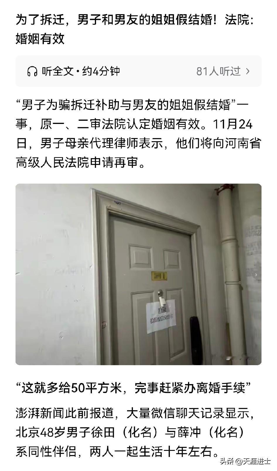 婚姻法看的是结婚证和离婚证,只要是合法婚姻,法律就会保护。 近日“男子为骗拆迁补助和男友的姐姐假结婚”一事闹的沸沸扬扬,徐某和男友薛某为同性伴侣,已存在十多年关系,2024年徐某母亲所在村开始腾退安置,每户每人可享受50平方米安置房指标,该指标价格和市场价相差近4万元/平方米,意味着约200万元的利益。此外,每人还有二三十万元的过渡(安家)费。024年12月份徐某和薛某的姐姐办理结婚手续,薛某姐姐是寡居,两人聊天记录显示确实为了拆迁补助而结婚,2025年2月徐某车祸意外死亡,徐某母亲起诉徐薛的婚姻是无效婚姻,称为了骗取拆迁补助而假结婚,婚后并无同居关系。 但法院一审和二审均判决该婚姻是合法婚姻,法院表示徐某母亲未举证证明薛某姐姐与徐某存在法律规定的婚姻无效情形, 其以二人为获取不当利益而结婚为由主张婚姻无效, 法院不予支持。 通过此事可以看出,当公序良知和法律规定有些微矛盾时候,虽然他们确实是假结婚,也确实为了骗取拆迁补助,但依然会按照法律规定判决。
